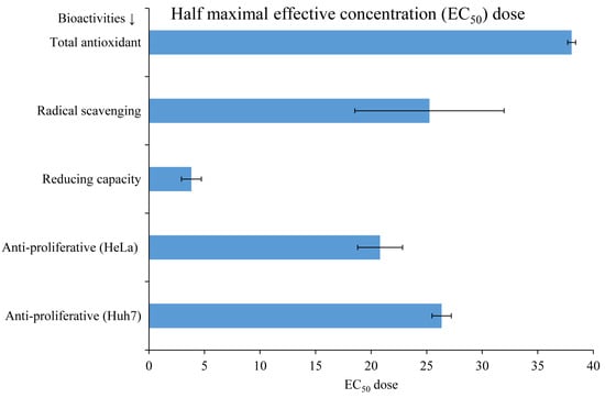 Determination of the half-maximal effective concentration (EC50) of Acrosiphonia orientalis for different bioactivities. Different concentrations of extracts were tested, EC50 was determined, and expressed as mean ± SE (n = 3).