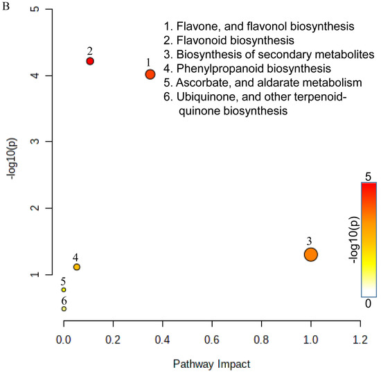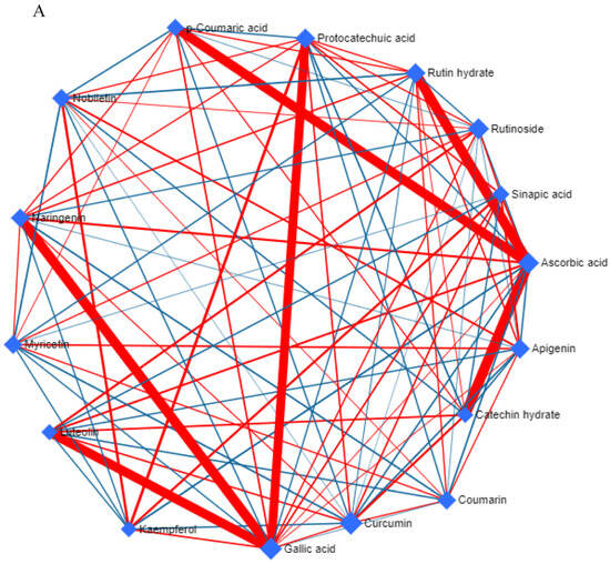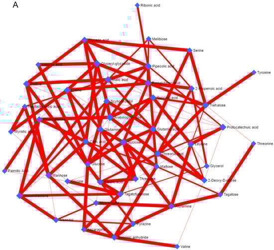 A metabolite–metabolite correlation-based network analysis was performed to understand the interrelationships of different metabolites in A. orientalis using GC-MS and HPLC datasets (Figure 2 and Figure 3). The metabolite–metabolite correlation was constructed through the range of p-values using the debiased sparse partial correlation (DSPC) with different network properties, such as node neighbors, average node degree, betweenness filter, degree filter, and correlation filter (Figure 2A and Figure 3A). The ideal thresholds for the current investigation were determined by a degree filter cutoff of 2.0 and a betweenness filter cutoff of 1.0. Positive correlations are shown as red edges, whereas negative correlations are represented by blue edges; thicker and medium red edges indicate stronger and weaker positive correlations between the metabolites, respectively. The network constructed from the A. orientalis GC-MS dataset included 46 nodes representing the identified metabolites and 118 edges suggesting strong positive correlations and variations in their interaction (Figure 2A). Sucrose had strong positive correlations with eight (glucose, maltose, glutamine, glutamic acid, pyroglutamic acid, threonine, and allylamine) different metabolites (Figure 2A). Furthermore, the network generated from the A. orientalis HPLC dataset had 16 nodes representing the metabolites and 91 edges demonstrating positive and negative correlations and variations in their interaction (Figure 3A). The metabolites–metabolites correlation might be positive or negative based on the content of metabolites in A. orientalis (Figure 2A and Figure 3A). Furthermore, the significantly altered metabolites were mapped onto the KEGG reference pathway of Arabidopsis thaliana in order to correlate the detected metabolites with the corresponding biological pathways that are active in A. orientalis (Figure 2B and Figure 3B). For pathway analysis, various parameters were employed, including the visualization method (scatter plot), enrichment method (hypergeometric test), and topology analysis (relative-betweenness centrality). The metabolic pathways are shown as a circle based on their score from enrichment analysis (−log10(p)) and topology analysis (pathway impact) (Figure 2B and Figure 3B). The brighter red color and larger circle size represent the higher metabolite alterations in the relevant pathway and pathway impact value, respectively (Figure 2B and Figure 3B). In this study, 47 and 6 metabolic pathways were identified from A. orientalis metabolites using GC-MS (Table 1) and HPLC (Table 3) datasets, respectively (Supplementary Tables S5 and S6). In the analysis performed with the GC-MS metabolite dataset, seven metabolic pathways (alanine, aspartate, and glutamate metabolism; glycine, serine, and threonine metabolism; glyoxylate and dicarboxylate metabolism; glutathione metabolism; citrate cycle (TCA cycle); phenylalanine metabolism; and isoquinoline alkaloid biosynthesis) were found to have higher impact values (≥0.1) in A. orientalis, whereas arginine biosynthesis and galactose metabolism had low impact values (Figure 2B). Furthermore, in an analysis performed on the HPLC dataset, three metabolic pathways (flavonoid biosynthesis, flavone, and flavonol biosynthesis, and biosynthesis of secondary metabolites—unclassified) were found to have greater impact values (≥0.1) in A. orientalis (Figure 3B). However, the impact values of phenylpropanoid biosynthesis and ubiquinone and other terpenoid–quinone biosyntheses were low.