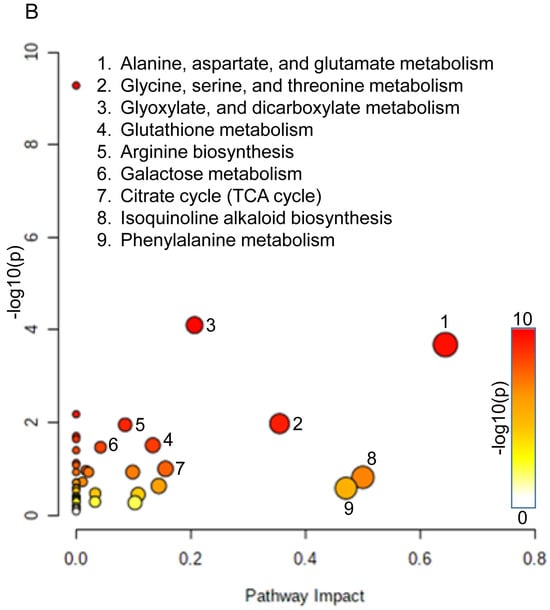 3.4. Metabolic Network and Pathway Enrichment Analysis to Elucidate the Interactions between Metabolite Changes and Metabolic Pathways