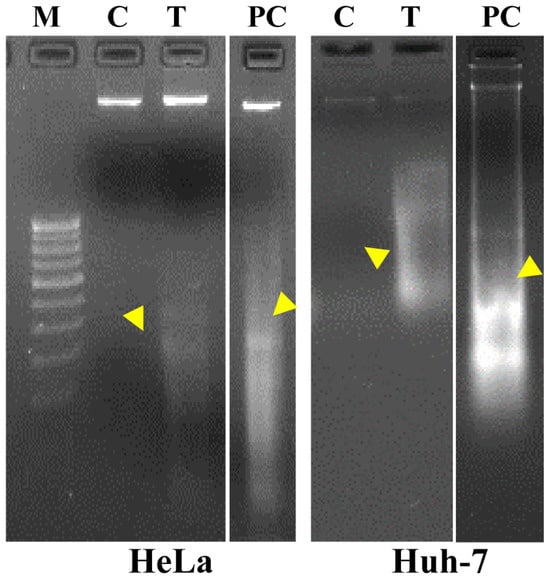 Apoptosis analysis by DNA fragmentation. Agarose gel (1%) showed DNA fragmentation of cells (HeLa and Huh-7) treated with an EC50 dose of Acrosiphonia orientalis extracts. M: Marker (100 bp DNA ladder), C: control (untreated cells), T: treated cells, PC: positive control (cells treated with DMSO). Yellow color triangle shows DNA fragmentation.