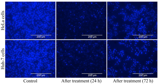 Apoptosis analysis by Hoechst assay. The DNA-specific fluorescent dye (Hoechst 33342) was used to stain cells (HeLa and Huh-7) treated with an EC50 dose of seaweed (Acrosiphonia orientalis) extracts for 24 h and 72 h, and observed under florescent microscope. Control was untreated cells.