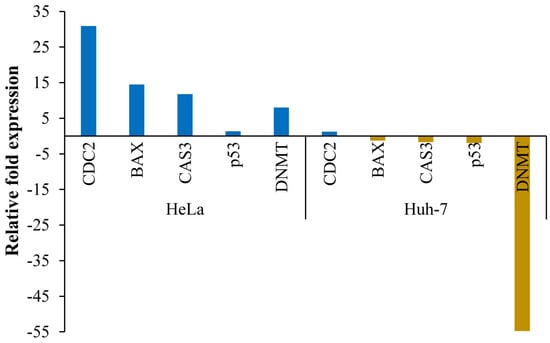 The transcript expression of key cancer-linked genes (CDC2, BAX, CAS3, p53, and DNMT) was studied in the cancer cell lines HeLa and Huh-7 (Figure 6). All genes were upregulated in HeLa cells but downregulated (except CDC2) in Huh-7 cells treated with an EC50 dose of A. orientalis extract. The CDC2 gene, which encodes cell division cycle protein 2, was upregulated by a maximum of about 30-fold followed by 15-fold upregulation of the apoptosis regulator B-cell lymphoma 2 (BCL2)-associated X protein encoding gene BAX. Caspase-3 encoding gene Cas3 and the DNA methyl transferase encoding gene DNMT2 were upregulated by about 12- and 8-fold, respectively, in treated HeLa cells. The tumor suppressor gene p53, which encodes protein p53, was also slightly (1.3-fold) upregulated in treated HeLa cells. Interestingly, all key genes (except CDC2) were downregulated in Huh-7 cells, with the DNMT gene being the most downregulated, by 55-fold. The results indicated that A. orientalis extract prevented the proliferation of hepatoma cancer cells more strongly than that of cervical cancer cells.