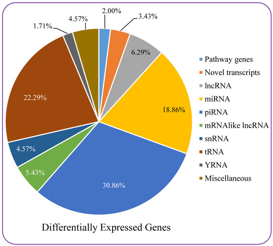 Among 350 differentially expressed transcripts, most transcripts (30.86%) were piRNAs (piwi-interacting RNAs), followed by 22.29% tRNAs (transfer RNAs), 18.86% miRNAs (micro RNAs), 6.29% lncRNAs (long non-coding RNAs), 5.43% mRNA, such as lncRNAs, and 4.57% snRNA (small nuclear RNAs). About 3.43% of differentially expressed transcripts were novel transcripts, and 2% genes belonged to different functional pathways. The remaining 4.57% transcripts were miscellaneous (Figure 7). Seven key functional genes were found that were differentially expressed (up or down) in Huh-7 cells (Table 4).