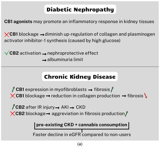 As was mentioned, THC and CBD interact with two distinct receptors in the kidneys: CB1 and CB2 [121]. Studies on animals indicate that blocking CB1 may decrease albuminuria and renal fibrosis. CB2 activation may potentially be protective, as described earlier [122].