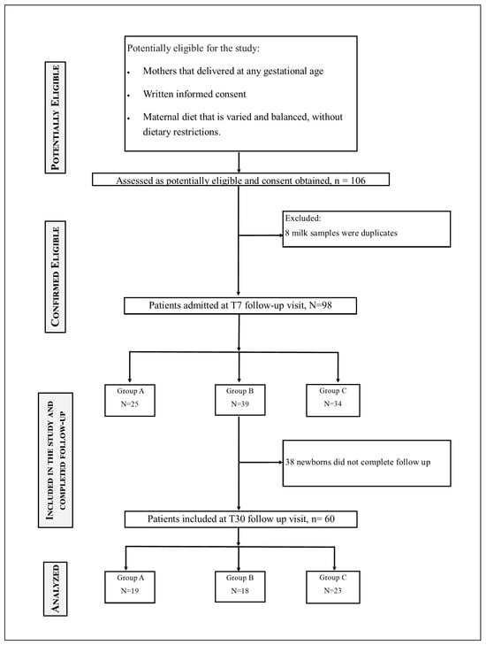 A prospective observational cohort study was conducted at the Department of Woman and Child, Buon Consiglio Fatebenefratelli Hospital, Naples, Italy, from March 2022 and October 2023. This study is registered and publicly accessible at https://clinicaltrials.gov/study/NCT05989009, accessed on 18 July 2025. Inclusion criteria were mothers who have given birth at the hospital at any gestational age, written informed consent, and a balanced diet without dietary restrictions. Exclusion criteria were food intolerances, Celiac disease, vegan or vegetarian diet, diet excluding milk, diagnosis of metabolic diseases (e.g., diabetes, hypercholesterolemia, gout) and withdrawal of informed consent. The recruited mothers were divided into three groups based on the GA at birth:
