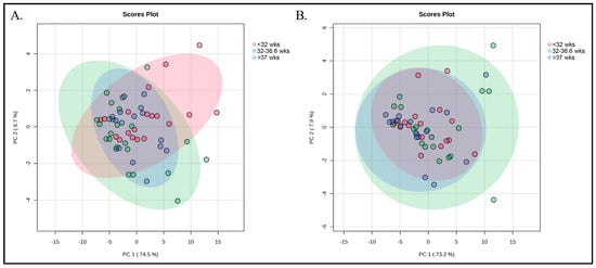 PCA score plots of relative FAME concentrations obtained via GC–MS and normalized to an internal standard. Data were autoscaled prior to analysis. (A) PCA for time point T7. (B) PCA for time point T30. Samples are coloured according to gestational age group: <32 wks group (red), 32–36 wks group (green), and >37 wks group (blue). Ellipses represent the 95% confidence regions for each group. PC1 accounted for 78.3% and 74.8% of the variance for T7 and T30, respectively, while PC2 explained 6.0% and 10.2%.