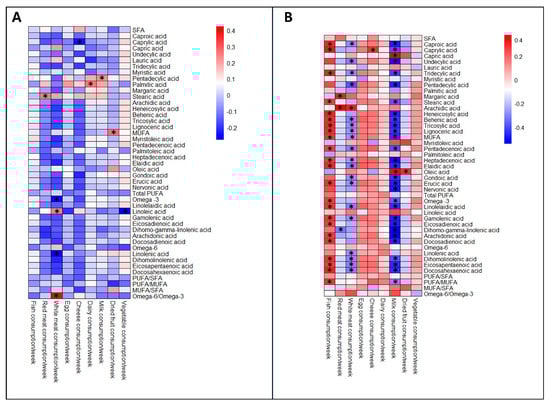 Heat map plot representing the correlation matrix between nutritional habits and fatty acids in breast milk. The intensity of the colour represents the degree of correlation. Positive correlation values are higher the more the colour tends toward red, while negative correlation values are lower the more the colour tends toward blue, as shown in the coloured box on the right. (A) T7 and (B) T30. * p < 0.05.