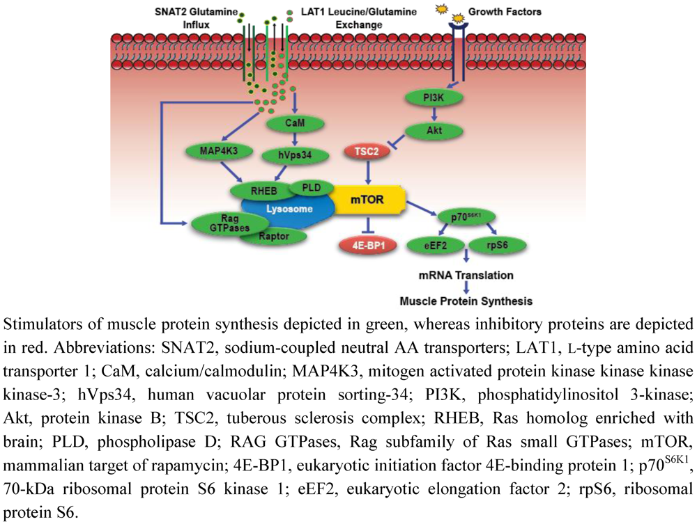 EAA and particularly leucine act as nutrient signals stimulating MPS by triggering critical steps involved with mRNA translation through the mTORC1 signaling network [63,64]. Transient elevations in plasma insulin concentrations secondary to AA administration [52,65], with concomitant changes in the expression and activity hVps34 [6,7], MAP4K3 [9], and subsequent long-term adaptations of the Rag GTPases [10,66], play a central role in the regulation of AA-induced mTORC1 signaling and MPS. Recent studies also suggest that the function of specific AA transporters contribute to the regulation of MPS in response to various stressors by modulating AA flux, ultimately enhancing muscle intracellular AA availability [11,12,67].