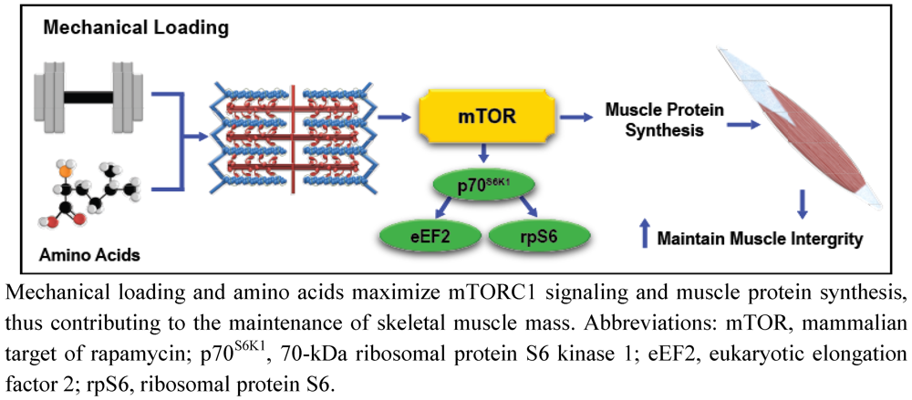Simplified illustration of the combined effects of mechanotransduction and amino acid-mediated anabolic signaling on skeletal muscle integrity.
