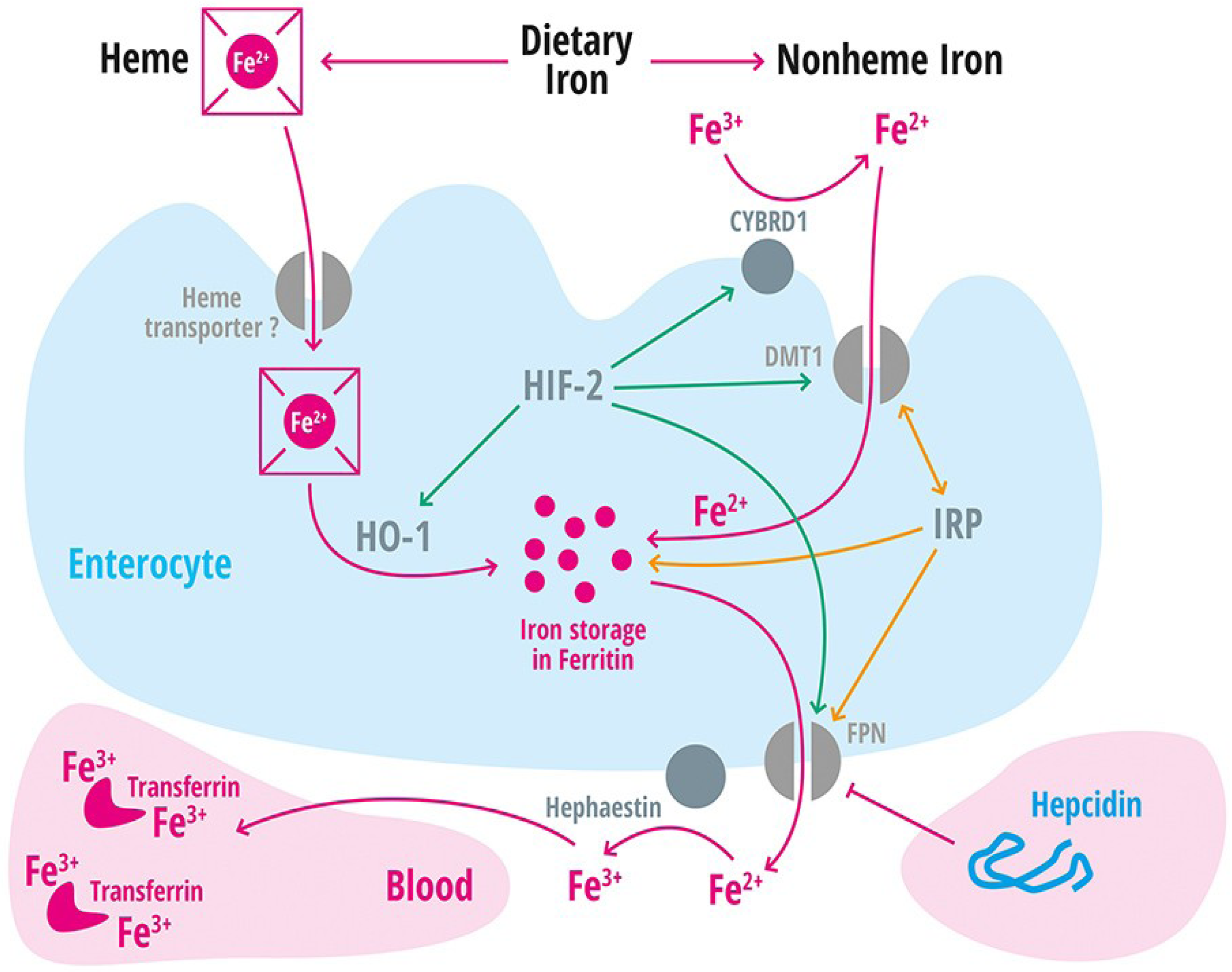 Iron absorption in the intestine. In the human diet, iron is present as heme or nonheme iron. Absorption of heme iron (Fe2+) is incompletely understood and likely mediated by a heme transporter. Intracellularly, iron is released from heme by hemoxygenase-1 (HO-1). Nonheme iron (Fe3+) is reduced by the membrane-associated ferric reductase CYBRD1 (DCYTB) for transport into the intestinal enterocyte by the divalent metal transporter (DMT1). Within the enterocyte iron can be stored in ferritin or exported into the blood stream by the iron exporter ferroportin (FPN1, SLC40A1). FPN expression is controlled by hepcidin. Hephaestin, a multicopper oxidase is required to incorporate two Fe3+ into one transferrin molecule (Tf). Hypoxia inducible factor 2 (HIF-2) controls CYBRD1, DMT1, FPN, and HO-1 mRNA expression (depicted in green) and iron regulatory proteins (IRPs) post-transcriptionally control the expression of DMT1, ferritin, and FPN (depicted in orange).