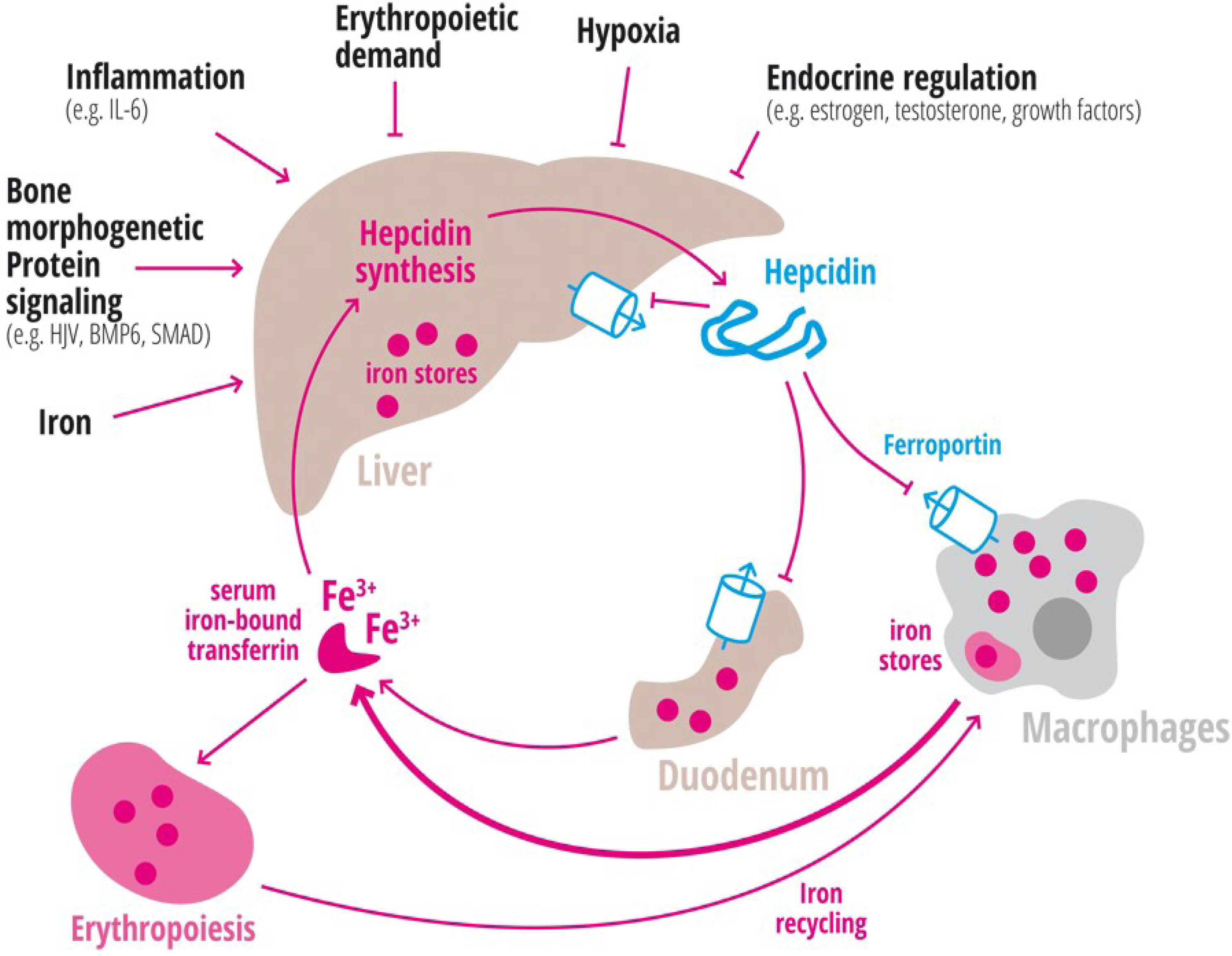 Anemia of chronic disease (ACD) is a mild to moderate normocytic, normochromic anemia which occurs as a consequence of chronic infection, inflammation, or neoplasia. Hepcidin activation by cytokines causes low serum iron levels and transferrin saturation, but ferritin levels are high due to inflammation [64,131]. In ACD, oral iron supplementation is ineffective as elevated hepcidin levels impair intestinal iron absorption. In addition, intravenous iron only marginally improves the anemic state, as iron becomes trapped in storage sites such as macrophages and hepatocytes as a consequence of ferroportin degradation by hepcidin.
