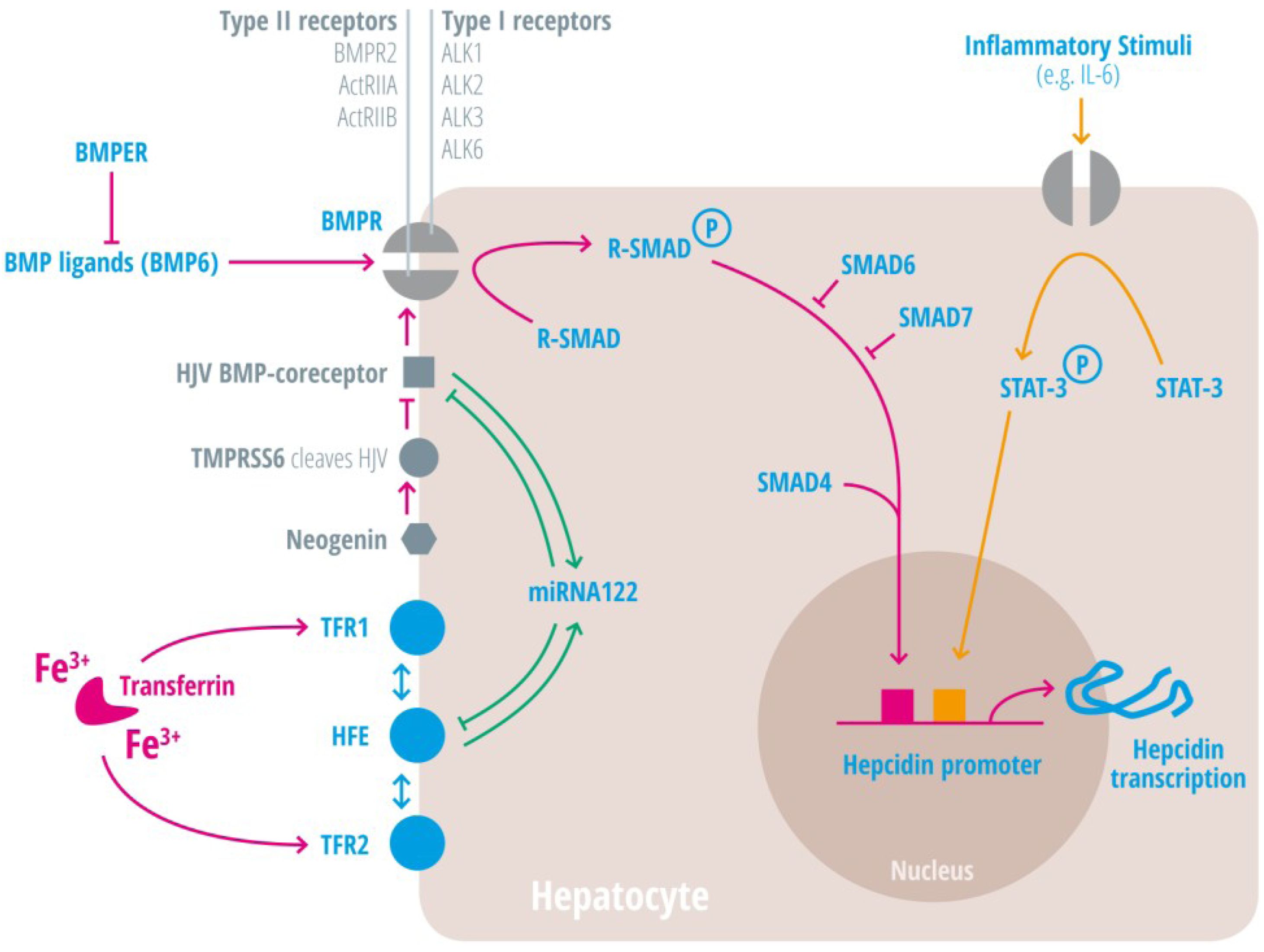 Regulation of hepatic hepcidin induction at the cellular level. Transferrin bound iron (Tf-Fe) is monitored by an “iron sensing complex”, which consists of the transferrin receptors (TfR) 1 and 2, HFE, and HJV. HJV is a glykosylphosphatidylinositol (GPI)-linked membrane associated protein that functions as a BMP coreceptor, and enhances bone morphogenetic protein (BMP) signaling. Binding of one of the more than 25 known BMP ligands (such as BMP6) to type I and II BMP receptors induces the type II receptor to phosphorylate and activate the BMP type I receptor. There are four BMP type I receptors (called ALK1, ALK2, ALK3, and ALK6), and three BMP type II receptors (BMPR2, ActRIIA, and ActRIIB). The activated BMP type I receptor leads to phosphorylation of intracellular signaling molecules called receptor associated SMAD proteins (R-SMADs). Phosphorylated R-SMADs transfer together with SMAD 4 to the hepatocyte nucleus and induce hepcidin transcription. SMAD6 and SMAD7 are inhibitory SMADs. BMPER, the BMP endothelial cell precursor-derived regulator inhibits BMP signaling and decreases hepatic hepcidin expression. MicroRNA 122 is activated by HFE or HJV and inhibits the latter in a negative feedback regulatory loop. The transmembrane serine protease (TMPRSS6) cleaves HJV and thereby decreases BMP-mediated hepcidin induction. Neogenin, a transmembrane protein known to interact with HJV, can also interact with TMPRSS6 to enable HJV cleavage in transfected cells. Soluble HJV is generated by proprotein convertase activity and has been proposed to sequester BMPs. Inflammatory stimuli such as interleukin-6 (IL-6) induce hepcidin transcription via the JAK/STAT signaling pathway. A SMAD- and a STAT-binding element have been identified in the hepcidin promoter.