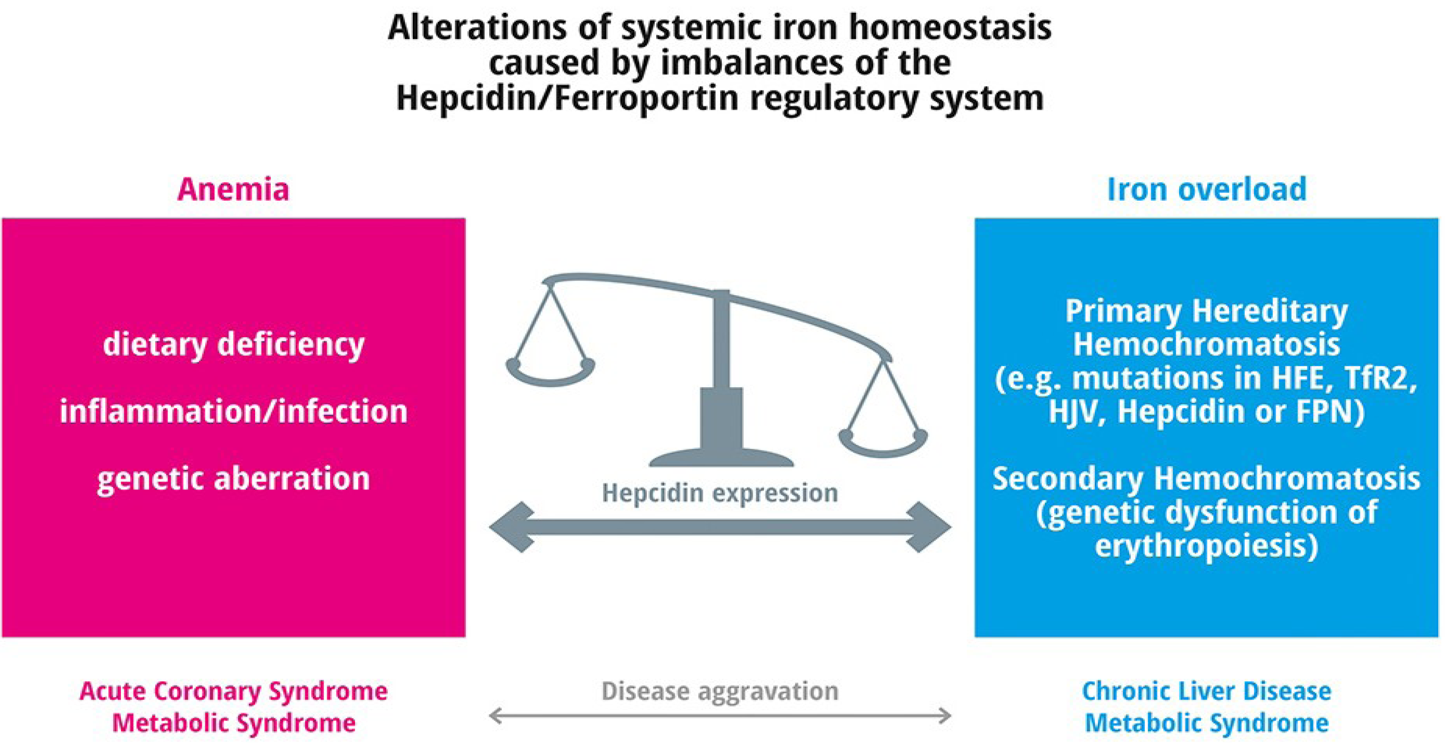 Alterations of systemic iron homeostasis caused by imbalances of the Hepcidin/Ferroportin regulatory system.