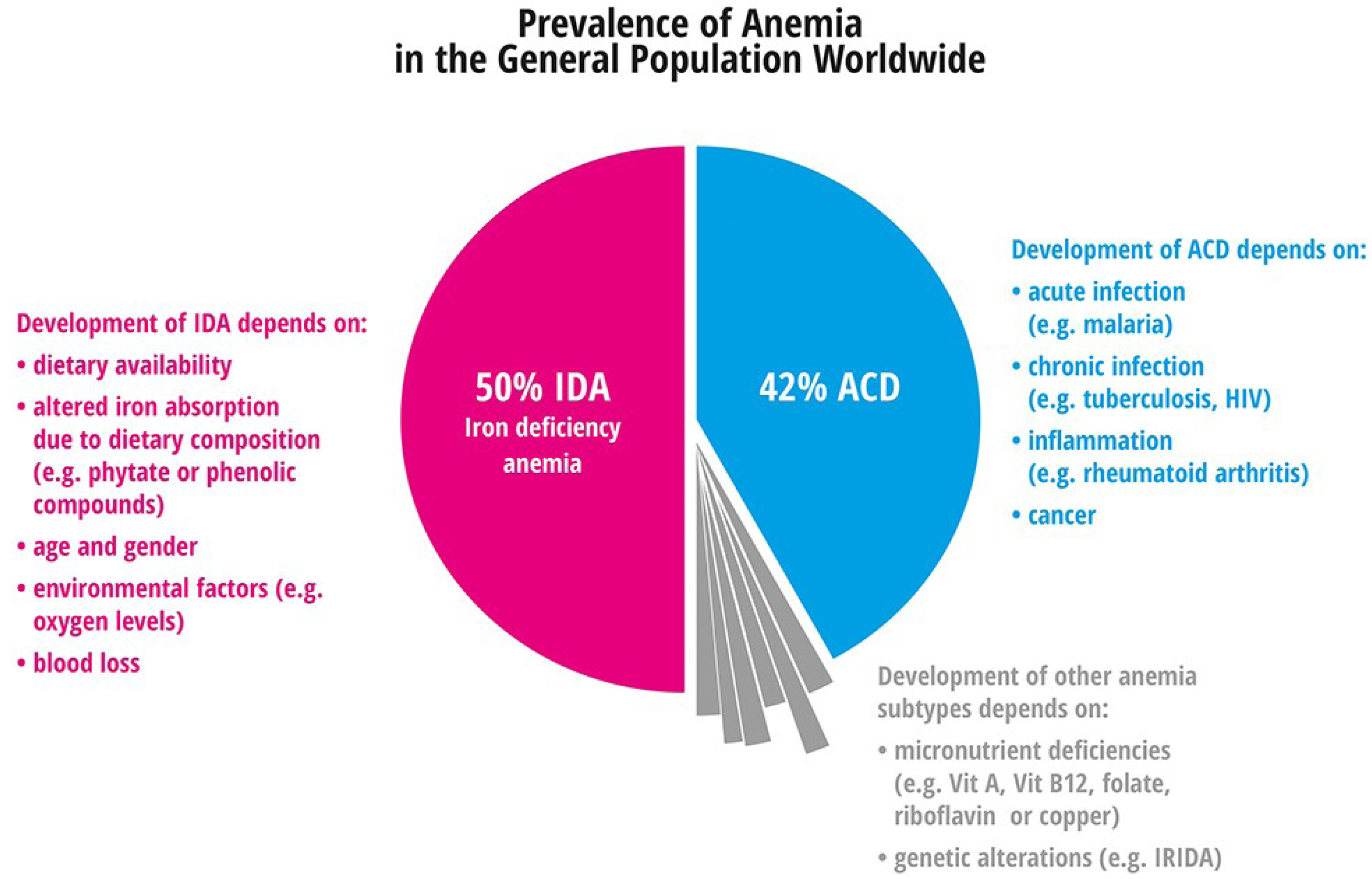 Iron deficiency can occur both with or without anemia as reviewed by Denic and Agarwal [127]. It generally protects against infectious diseases such as malaria [127], but limited iron intake is associated with the aggravation of frequent diseases such as acute coronary syndrome. The prevalence of different anemia subtypes is shown in Figure 5. About 50% of anemias arise from nutritional iron deficiency, 42% are caused by inflammation and infection. The remaining 8% of anemias develop due to nutritional deficiencies (such as vitamin A, vitamin B12, folate, riboflavin, or copper), or are genetically caused. In the following paragraph details on frequent and rare anemias are listed: