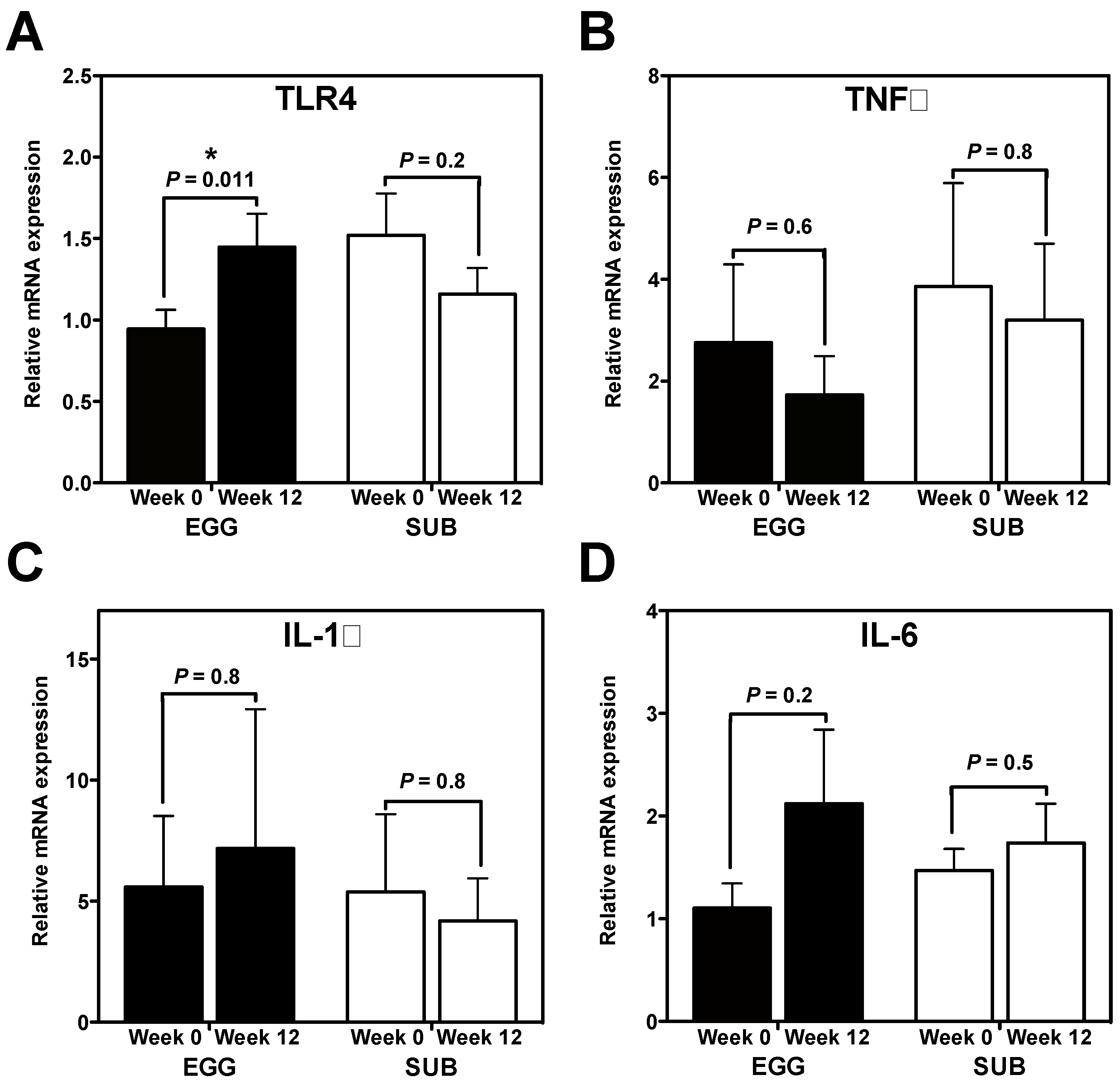 We sought to determine whether our dietary intervention modulated inflammatory PBMC gene expression. Interestingly, while we did not observe changes in IL-6 (Figure 1B), IL-1β (Figure 1C), or TNFα (Figure 1D) mRNA expression in either group, TLR4 mRNA expression increased from baseline to week 12 in the EGG group only (Figure 1A). No significant changes in PBMC NF-κB p65 DNA binding activity were observed in either group (data not shown).