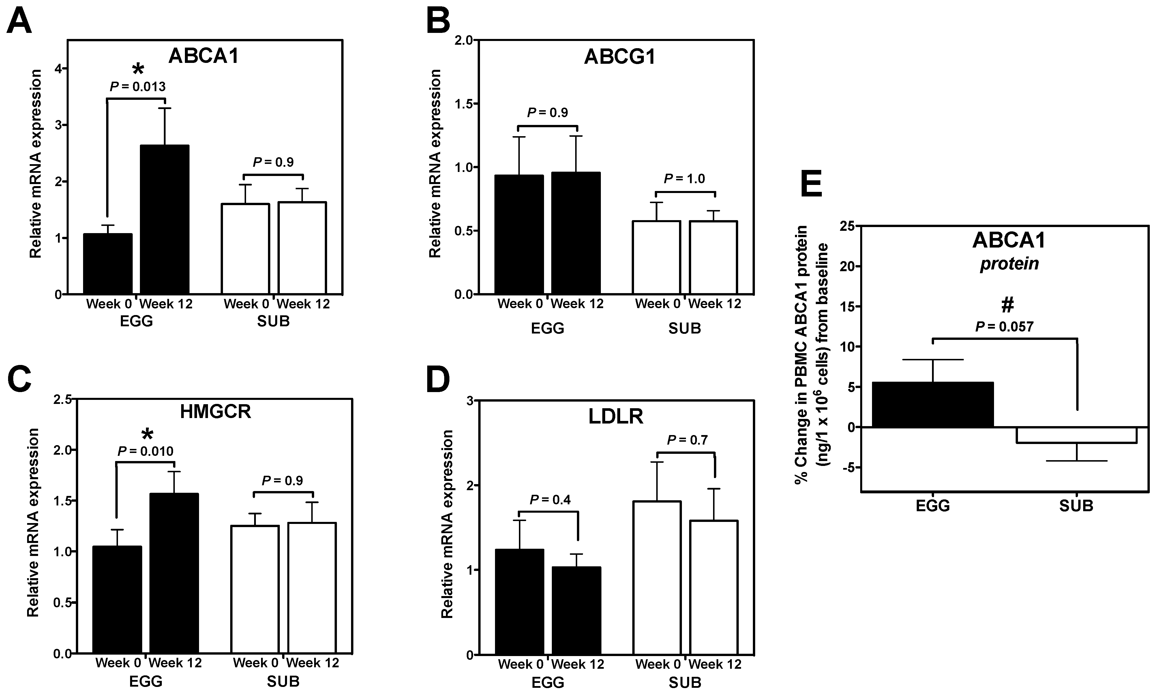 We further aimed to identify whether this change corresponded to alterations in the expression of genes related to cholesterol efflux (ABCA1 and ABCG1), synthesis (HMGCR), and uptake (LDLR). Interestingly, ABCA1 mRNA expression significantly increased from baseline to week 12 in the EGG group only (Figure 3A). We similarly observed a trend toward an increase in ABCA1 protein in the EGG group from baseline to week 12 (P = 0.07; data not shown), as well as a strong trend toward greater percent change in ABCA1 protein from baseline in the EGG group (+5.5% ± 9.4%) when compared to the SUB group (−1.9% ± 7.1%) (Figure 3E). EGG group-specific increases in HMGCR mRNA expression were also observed from baseline to week 12 (Figure 3C), whereas no changes in ABCG1 (Figure 3B) or LDLR mRNA expression were observed in either group (Figure 3D).