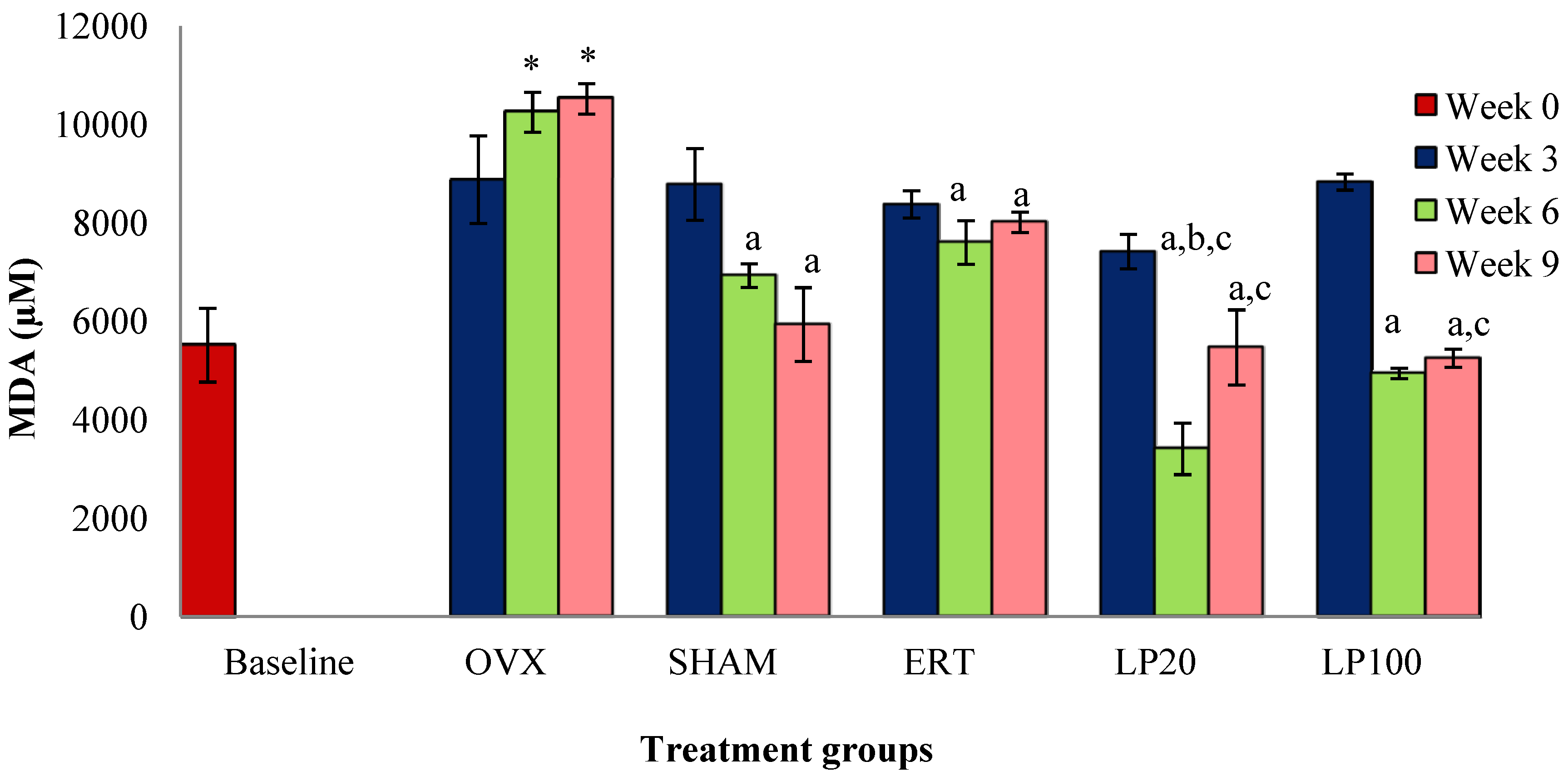 Mean melondialdehyde concentration for all the groups after 3, 6 and 9 weeks of treatment. Data presented mean ± SEM (p < 0.05). SHAM: sham-operated, OVX: ovariectomized control, ERT: ovariectomized and estrogen supplementation, LP20: ovariectomized and supplemented with LP at the dose of 20 mg/kg, LP100: ovariectomized and supplemented with LP at the dose of 100 mg/kg. * p < 0.05 versus Baseline; a p < 0.05 versus OVX at the corresponding weeks; b p < 0.05 versus SHAM at week 6; c p < 0.05 versus ERT at the corresponding weeks.