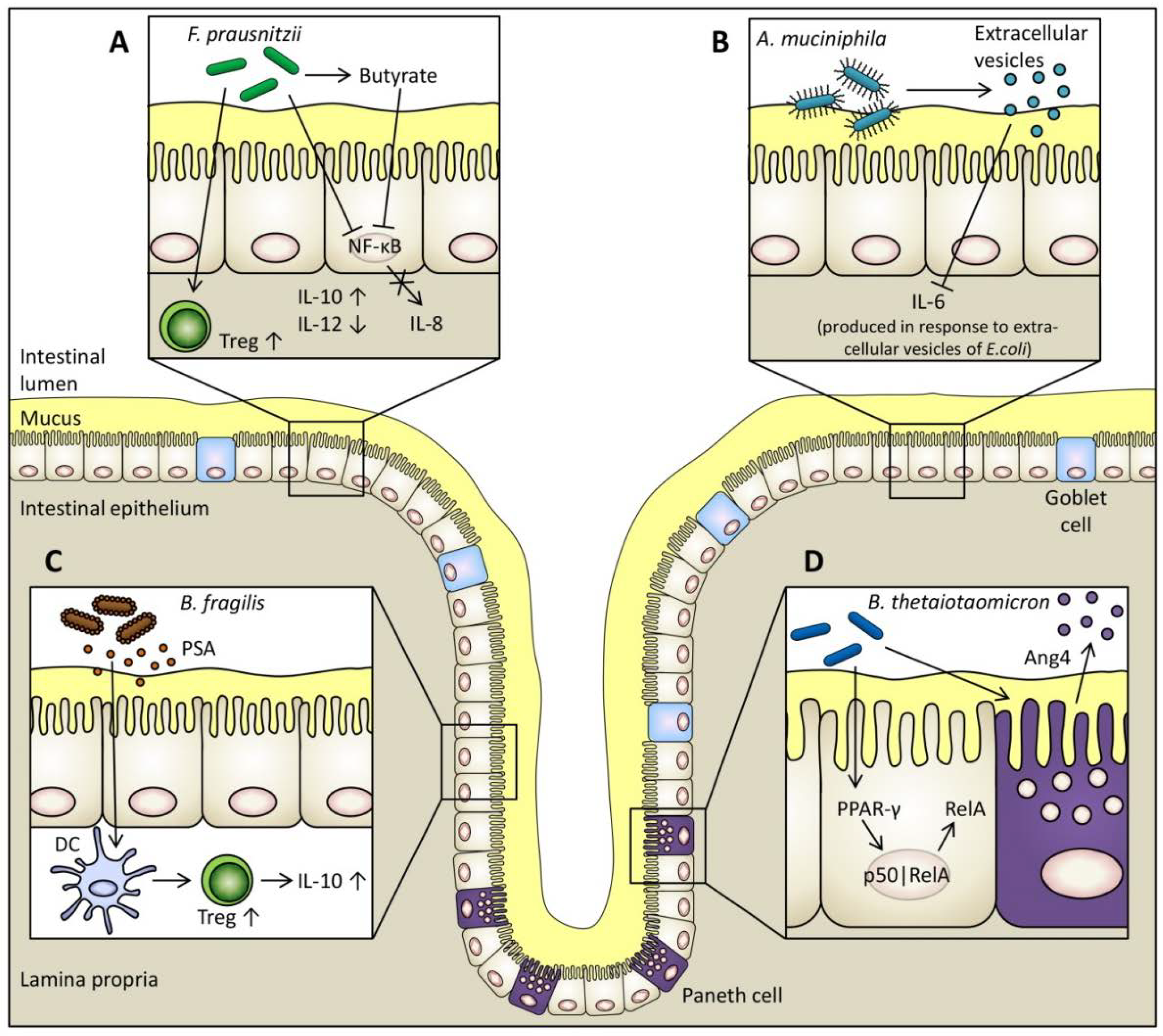 Proposed immunomodulatory mechanisms of four examples of obligate anaerobic commensals. (A) The supernatant of F. prausnitzii blocks the activation of transcription factor NF-κB which inhibits the production of pro-inflammatory IL-8 by intestinal epithelial cells (IECs) [83]. F. prausnitzii is one of the major butyrate producers in the large intestine. Butyrate also blocks NF-κB activation [74]. Furthermore, F. prausnitzii increases the differentiation of regulatory T cells (Treg) [84] and the production of anti-inflammatory IL-10 by peripheral blood mononuclear cells and decreases the production of pro-inflammatory IL-12 [83,84]. (B) Extracellular vesicles produced by A. muciniphila block the production of pro-inflammatory IL-6 from colon epithelial cells in response to extracellular vesicles of Escherichia coli [29]. (C) A surface molecule of B. fragilis, polysaccharide A (PSA), exerts immunomodulatory functions within the GIT. PSA is recognised by DCs which induces increased production of regulatory T cells and anti-inflammatory IL-10 [85,86]. (D) B. thetaiotaomicron causes the PPAR-γ dependent nuclear export of the NF-κB transcriptionally active subunit RelA in IECs which attenuates pro-inflammatory cytokine expression [27]. B. thetaiotaomicron also stimulates the release of the antimicrobial peptide Ang4 by Paneth cells thereby maintaining mucosal barrier function [28].