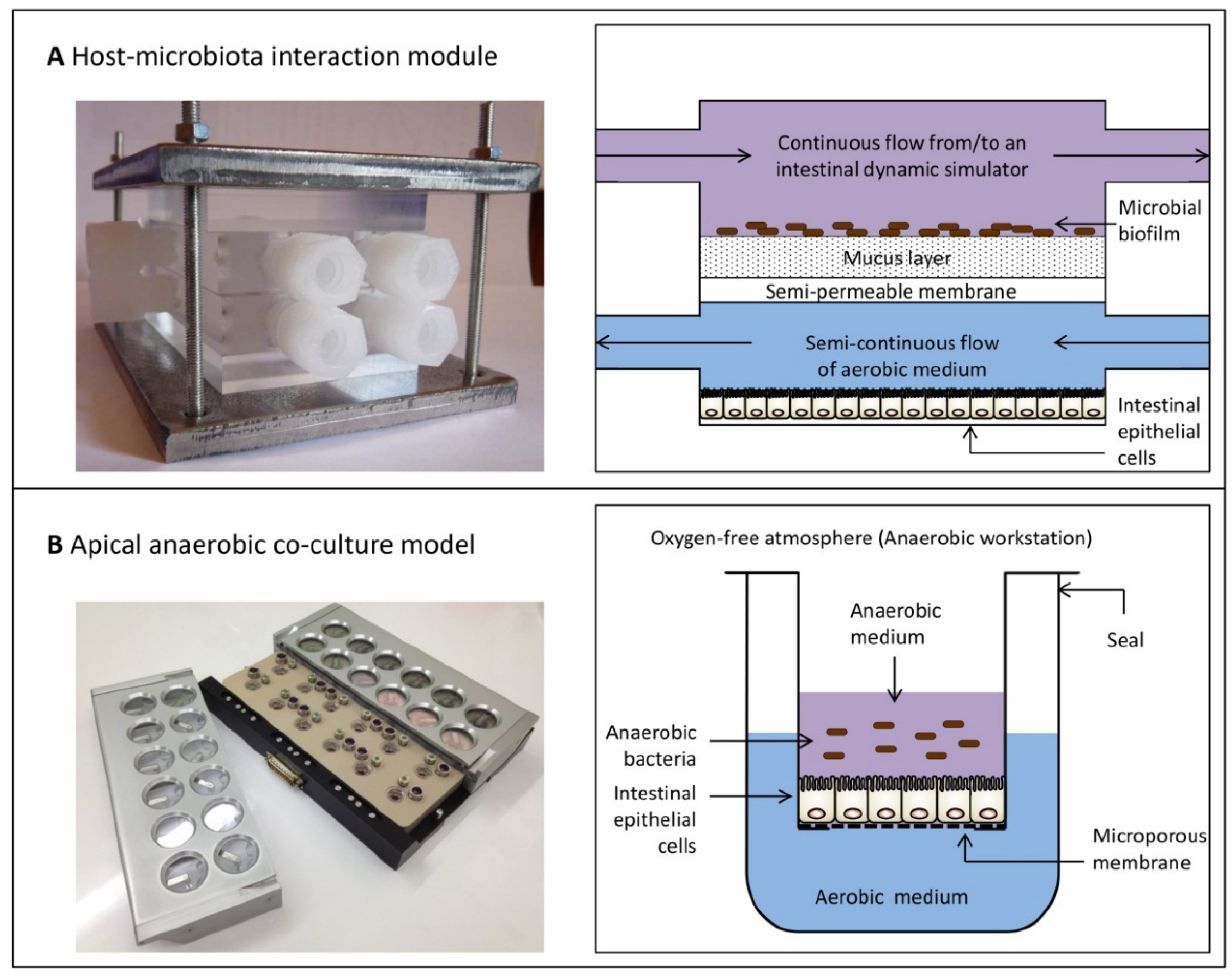 Recently, Marzorati et al. [129] developed the Host-Microbiota Interaction (HMI) module, a device that enables the co-culture of a complex microbial community, including obligate anaerobic bacteria, with enterocyte-like cells (Figure 2A). The HMI module can be used in combination with intestinal dynamic simulation, where digestion processes in the stomach, small intestine and colon are simulated in several reactors. Furthermore, the last compartment of this dynamic in vitro simulator, which mimics the ascending colon, is inoculated with faecal microbiota. In combination with this continuous culture system, the HMI module can be utilised to study bacterial adhesion to the mucus layer under relevant shear forces. It also allows the exchange of signals and metabolites between the two compartments, and through the diffusion of oxygen from the lower compartment, it creates microaerophilic conditions on the bottom of the microbial biofilm. Consequently, it is able to mimic the physiological conditions of the GIT. Moreover, due to the separation of the two compartments by the mucus layer, this model is more representative of the GIT compared to co-culture systems that allow direct contact between bacteria and host cells.