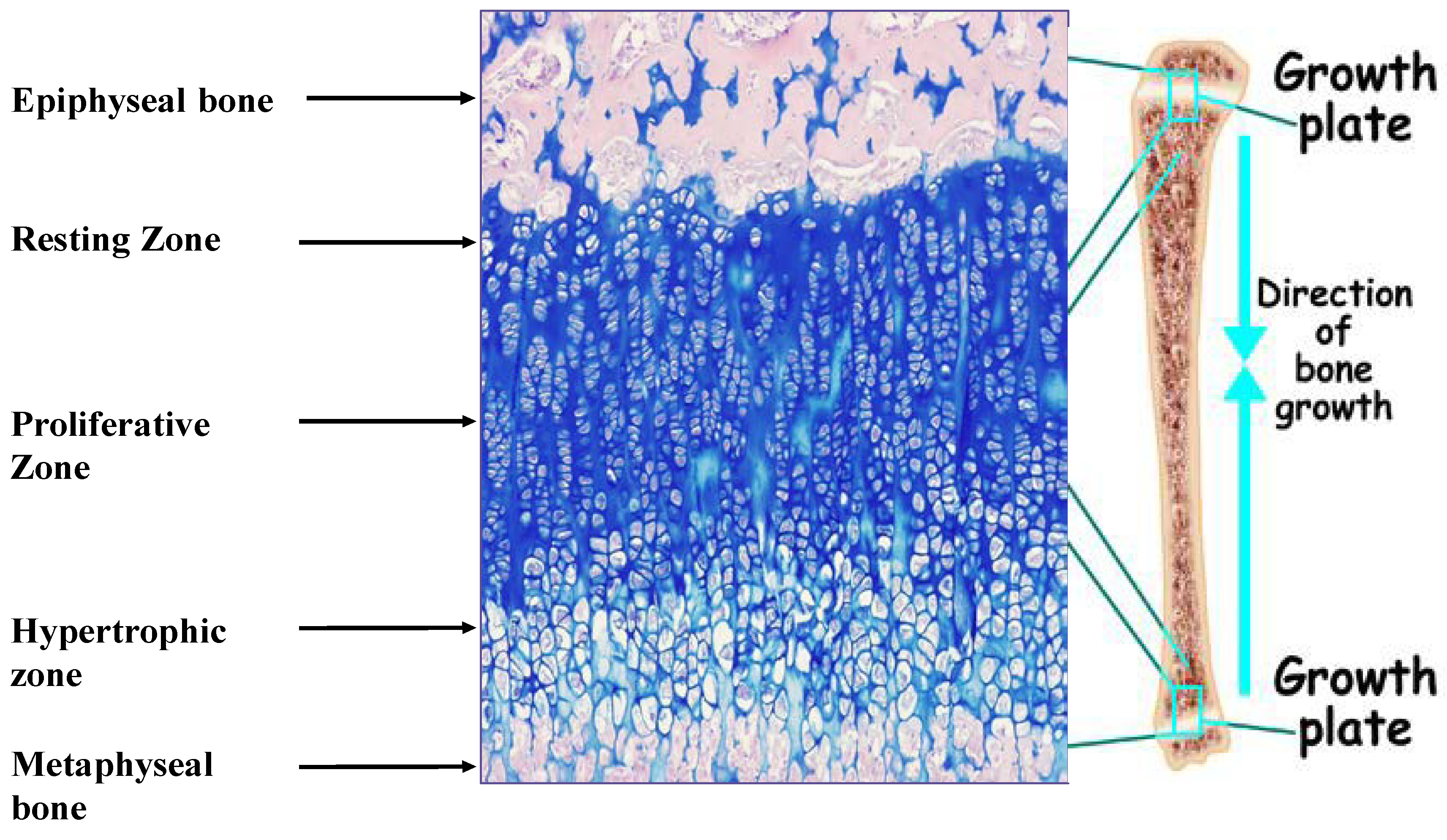 Epiphyseal growth plate of male Sprague Dawley rat (34 days old) stained with hematoxylin/eosine/Alcian Blue. Magnification, 100×. The different zones of the growth plate are marked.