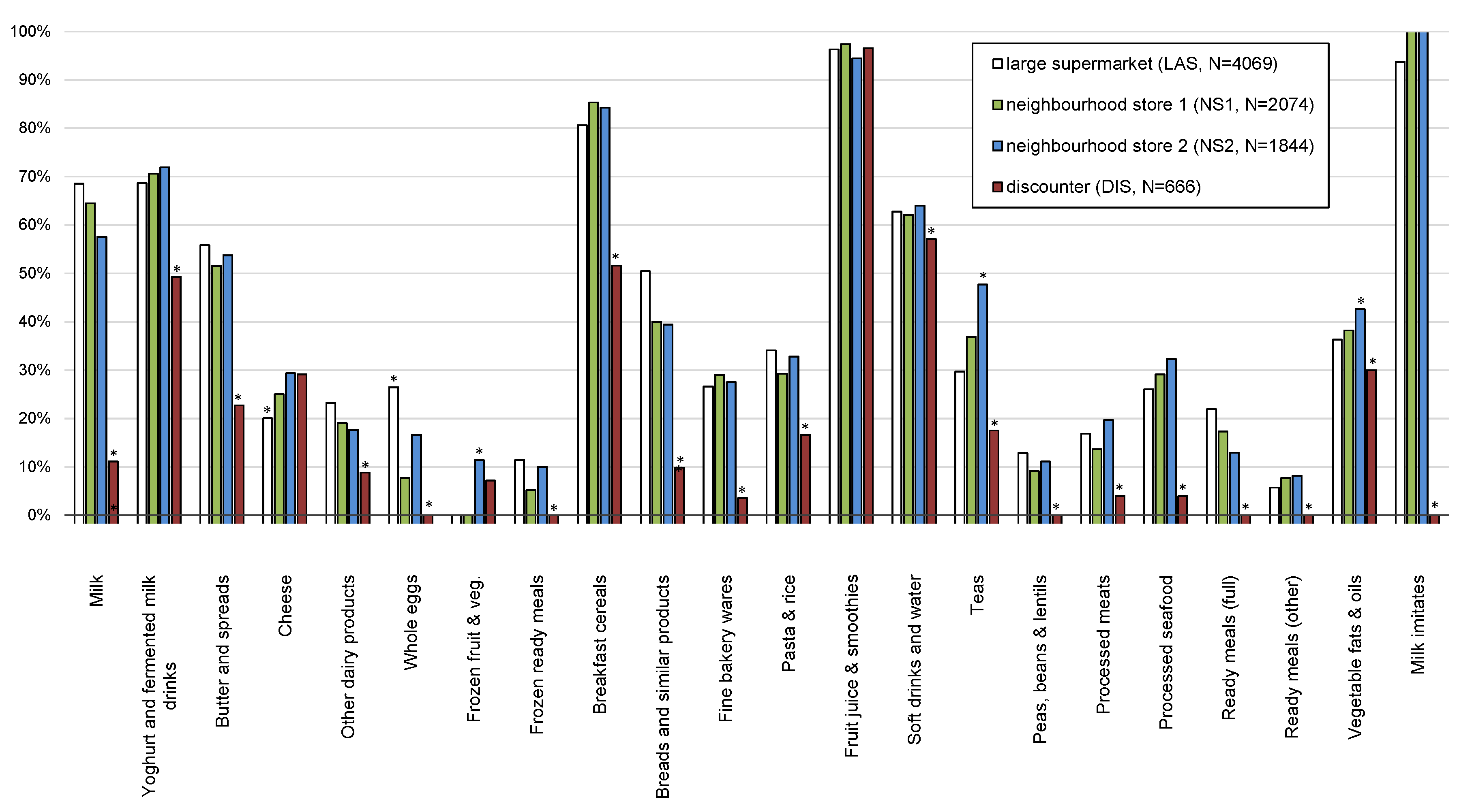 Sampling was done in four grocery stores in the capital, Ljubljana: one large supermarket (LAS), two neighborhood stores (NS1, NS2), and one discounter store (DIS). To ensure high representativeness of the sample, we selected grocery stores of retailers with accessible nation-wide store networks, and with the biggest market shares. The retailers included accounted for 66% of the total national market share in terms of sales value, and operated in all parts of the country.