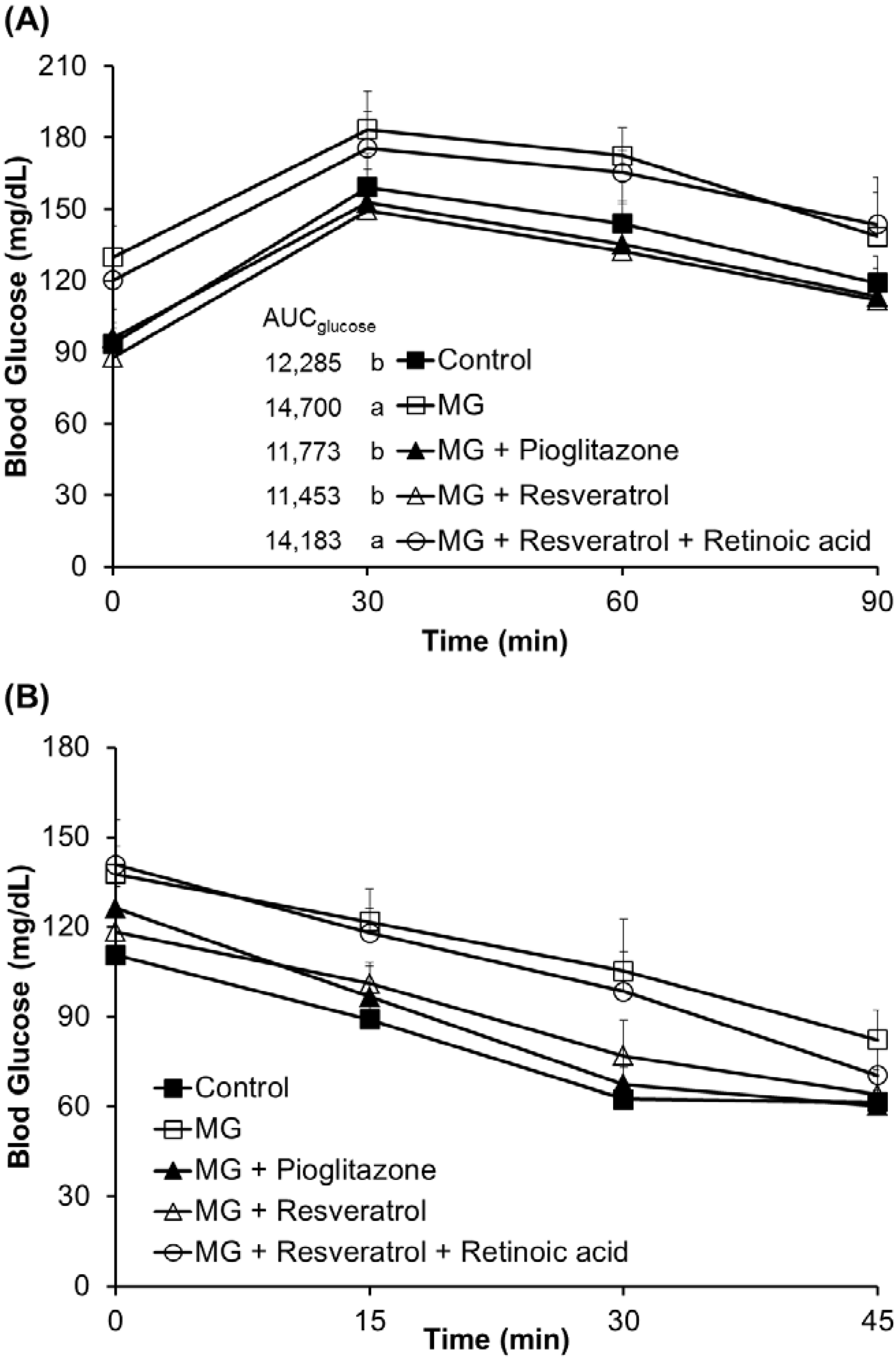The effects of resveratrol on the (A) oral glucose tolerance test (OGTT) and the (B) insulin tolerance test (ITT). The data shown represent the mean ± SD (n = 6). (a,b) indicate a statistically-significant difference at p < 0.05. MG: methylglyoxal.