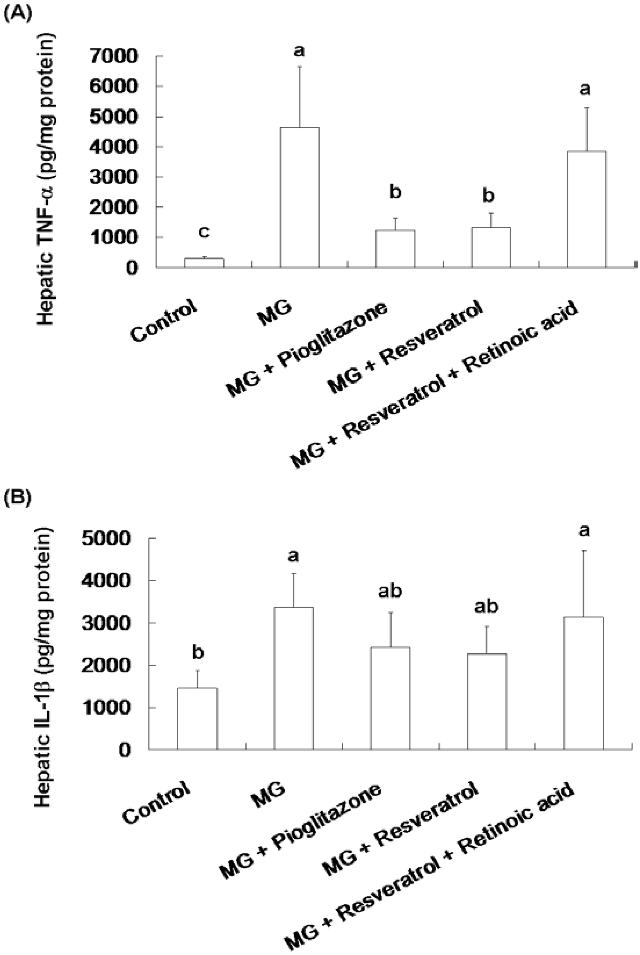 Figure 3 shows the effect of resveratrol on hepatic TNF-α and IL-1β contents in rats. Significantly higher hepatic TNF-α and IL-1β contents were observed in the MG group compared to the normal group, 4641.8 ± 2094.3 pg/mg protein vs. 283.5 ± 86.4 pg/mg protein and 3369.2 ± 790 pg/mg protein vs. 1462.9 ± 426.3 pg/mg protein, respectively (p < 0.05). MG-fed rats given pioglitazone and resveratrol had significantly reduced TNF-α contents of 73.6% and 71.3%, respectively (Figure 3A). Co-administration with resveratrol and retinoic acid did not alter the TNF-α and IL-1β of rats (Figure 3).