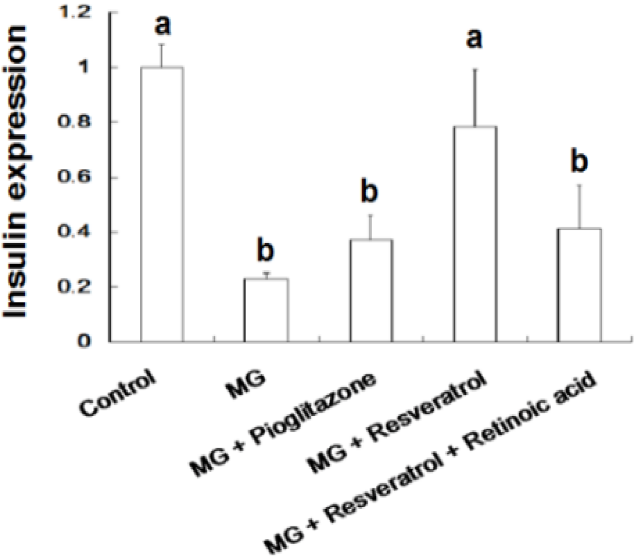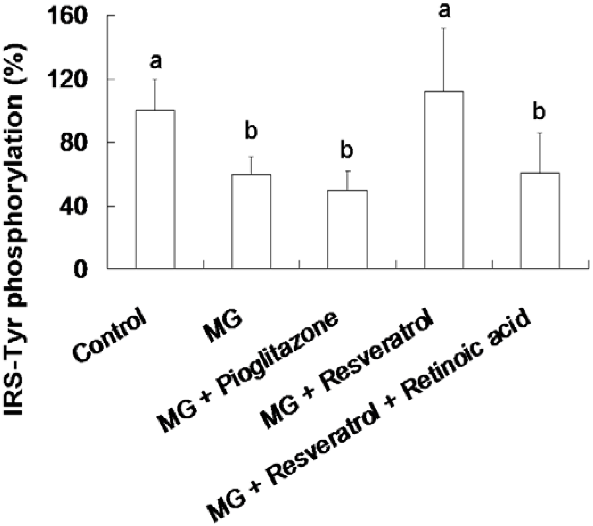 Figure 4 shows the resveratrol-mediated elevation of liver Tyr-phosphorylated IRS-1 levels in rats. The animal group fed with the MG-supplemented diet showed a 39.5% reduction in Tyr-phosphorylated insulin receptor substrate-1 (IRS-Tyr) expression in the liver compared to the control group (p < 0.05). Resveratrol (10 mg/kg body weight) enhanced IRS-Tyr expression in MG-fed rat liver by 85.5% of the rats fed with MG alone (p < 0.05). Moreover, there is no significant difference in the hepatic level of IRS-Tyr protein expressions in MG-administrated rats with added with pioglitazone or resveratrol and retinoic acid together (Figure 4).