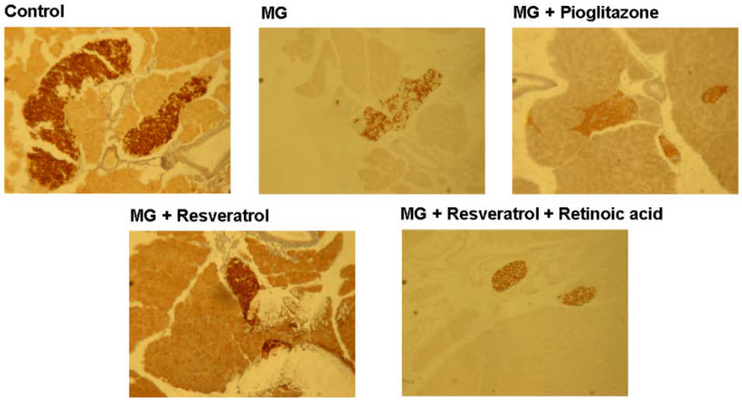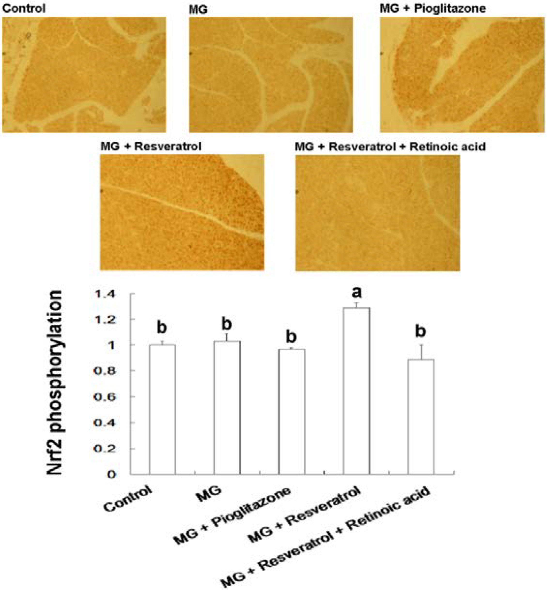 Figure 5 and Figure 6 show the immunohistochemistry (IHC) stain for pancreatic insulin and p-Nrf2 protein expression in rats. Our data show that the pancreatic contents of insulin and p-Nrf2 protein expression were decreased in MG-administrated rats alone (p < 0.05). The pancreatic level of insulin and p-Nrf2 protein expressions were increased in MG-administrated rats with added resveratrol (p < 0.05). However, there was no significant difference in the pancreatic level of insulin and p-Nrf2 protein expressions among MG-administrated rats with added pioglitazone or resveratrol and retinoic acid together, indicating the occurrence of the imbalance of redox after the administration of MG (Figure 5 and Figure 6).