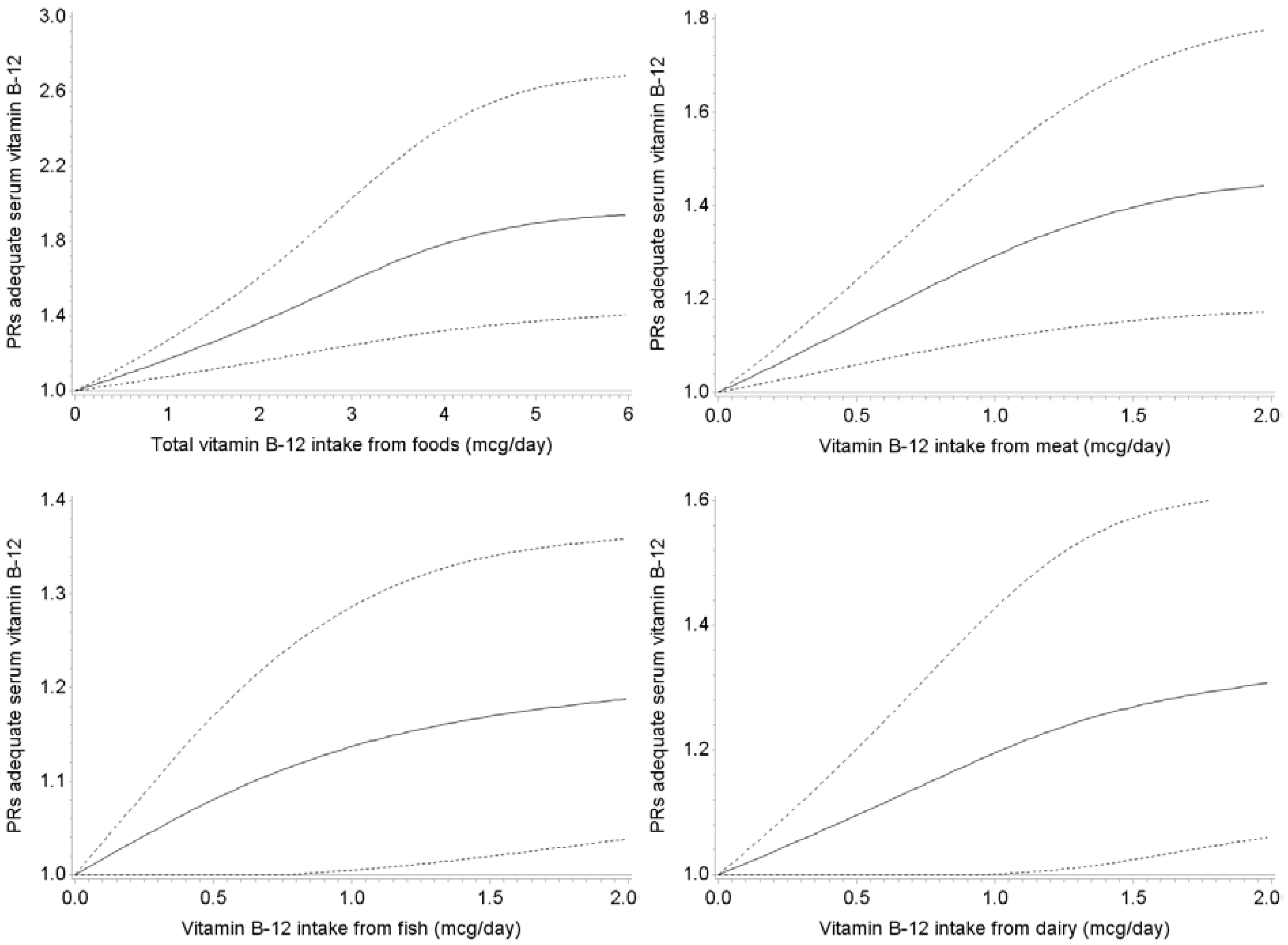 Associations between vitamin B-12-intake from different food sources with serum vitamin B-12-concentations ≥ 200 pmol/L, obtained by spline regression with three knots located at 1st, 5th, and 9th decile. Dotted lines represent 95% confidence intervals. Prevalence ratios were adjusted for age, sex, BMI, education, alcohol intake, physical activity level, smoking, creatinine, total energy intake, and intake of other vitamin B-12-containing food items. P for non-linearity was 0.003 for total vitamin B-12 intake; 0.002 for vitamin B-12 intake from meat; 0.16 for vitamin B-12 intake from fish and shellfish; and 0.34 for vitamin B-12 intake from dairy. P for linearity was 0.19 for vitamin B-12 intake from eggs; 0.06 for vitamin B-12 intake from milk; 0.94 for vitamin B-12 intake from yogurt; 0.44 for vitamin B-12 intake from cheese (data not shown).