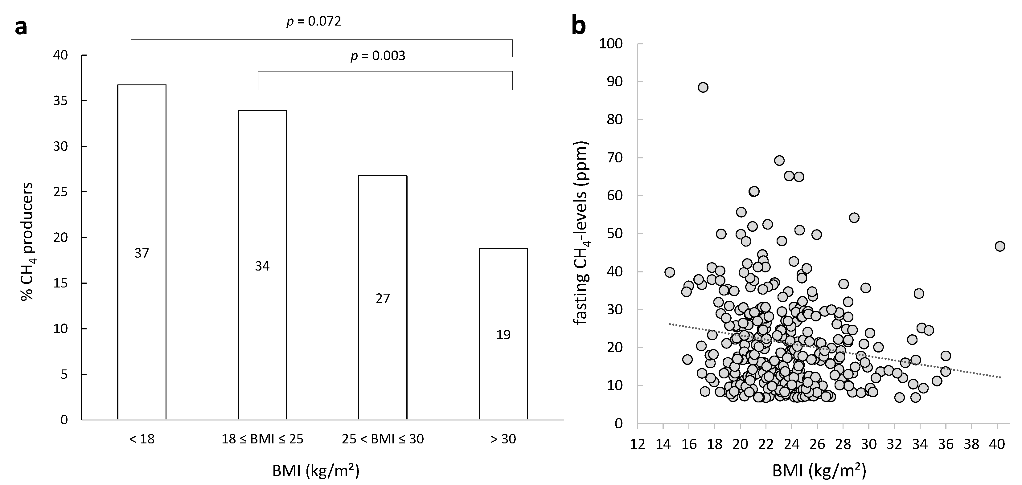 Percentage of CH4 producers in fasting state as function of body mass index (BMI) (a) and correlation between fasting CH4 and BMI (b).