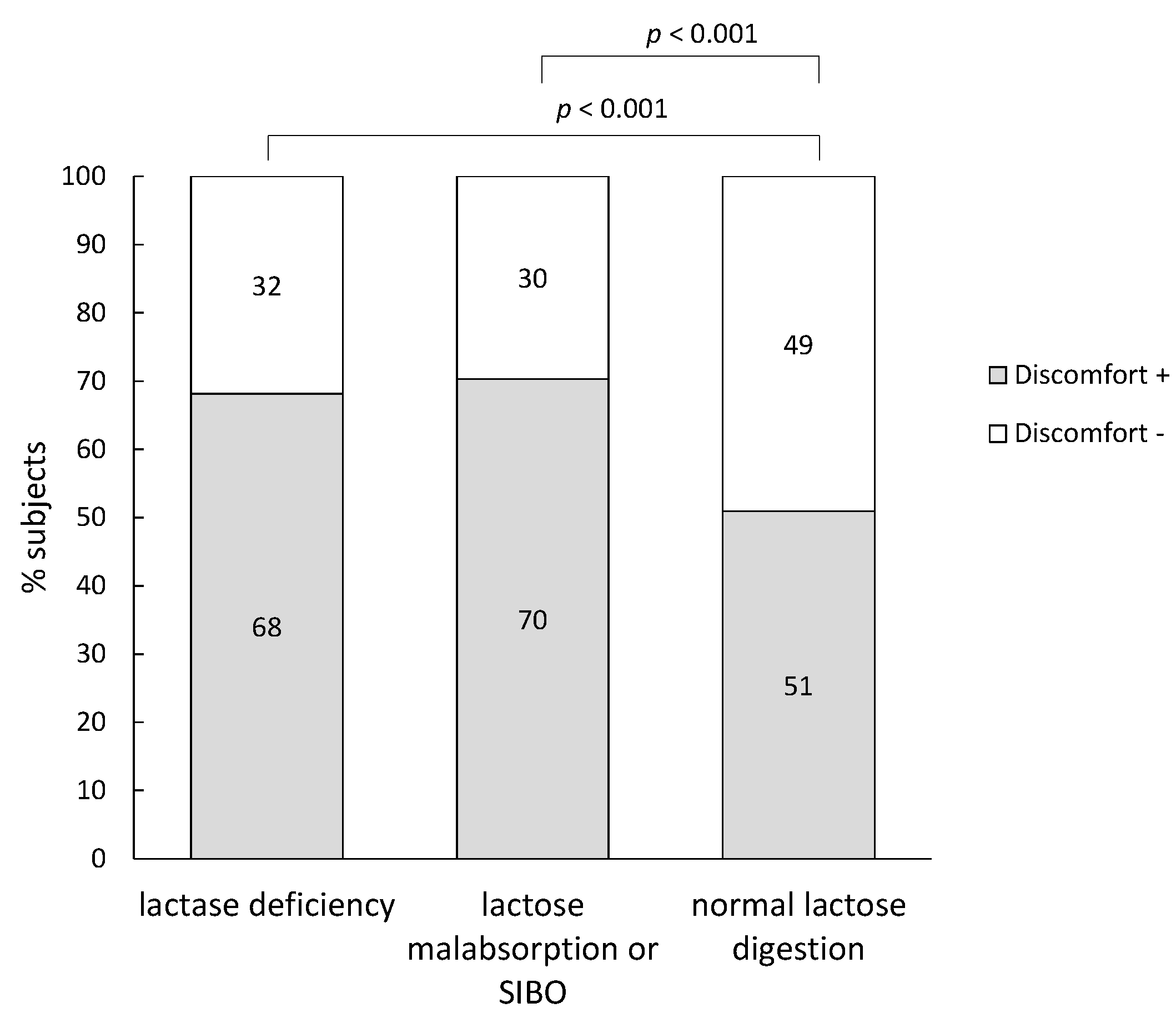 Figure 2 shows that subjects with lactase deficiency and subjects with lactose malabsorption or SIBO reported significantly more discomfort than subjects with normal lactose digestion (p < 0.001 and p = 0.0009, respectively). Remarkably, also about half of the subjects with normal lactose digestion reported discomfort.