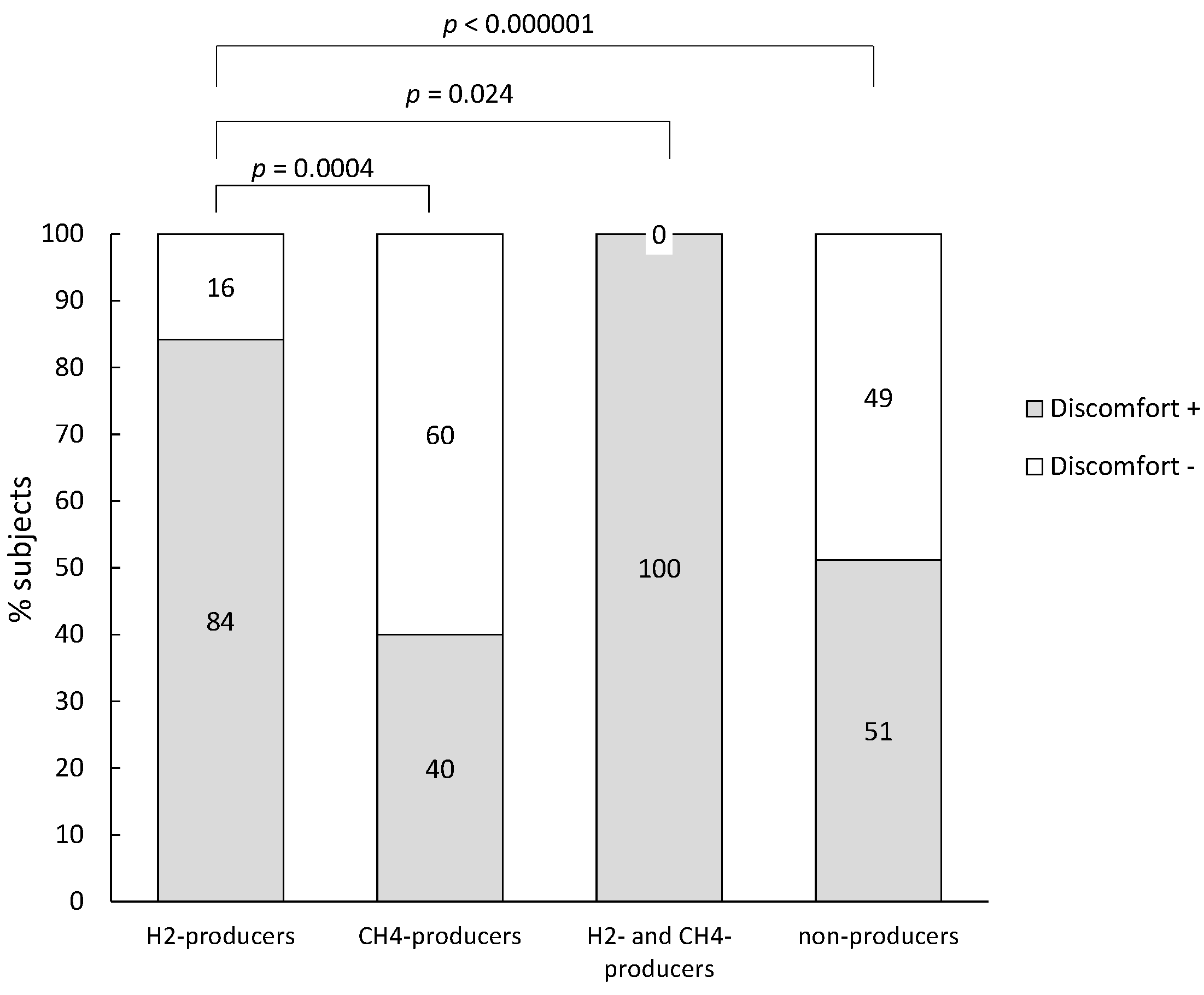 H2-producers reported significantly more discomfort compared to patients that produced no H2 (Chi Square, p < 0.001) (Figure 3).Within the group of subjects that only produced H2, H2-concentration was significantly higher for subjects that reported symptoms compared to subjects that did not experience symptoms (M-W, p = 0.002) (Table 2).