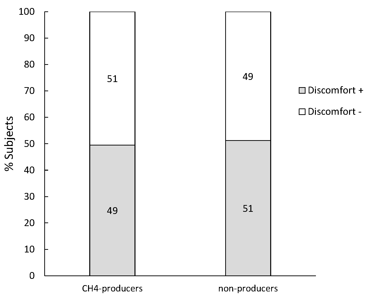 Of the 599 subjects with normal lactose digestion, 97 (16%) produced CH4 (Table 4). Remarkably, about half of these subjects reported discomfort, irrespective of whether they produced methane or not (Figure 5).
