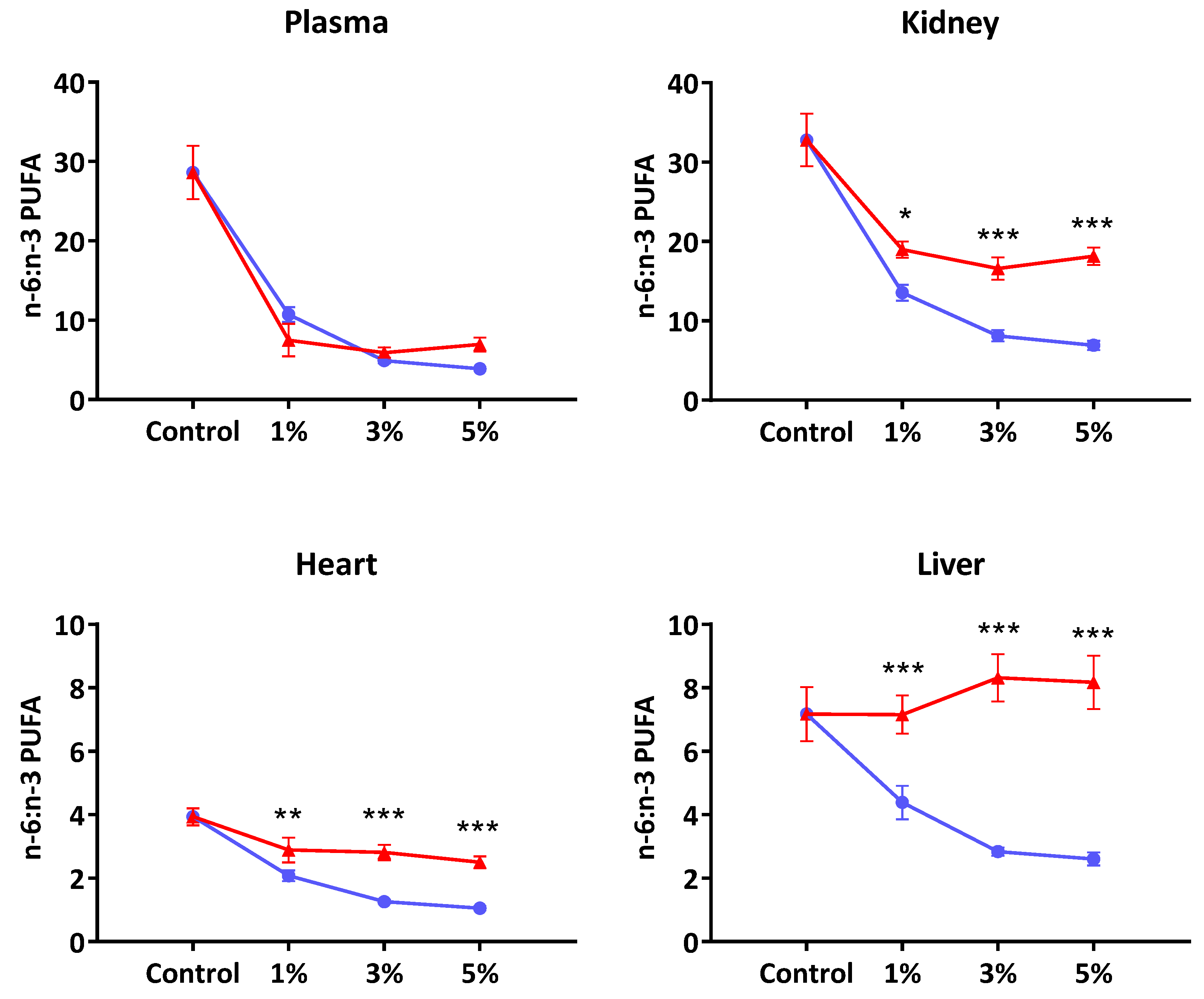 The ratio of total n-6 to total n-3 polyunsaturated fatty acids in tissue and plasma of rats fed standard laboratory diet (Control) or diet supplemented with Echium oil (EO, red) or fish oil (FO, blue) at 1, 3 and 5 percent (w/w). Values are mean ± SEM for n = 5 samples per group. Total n-3 PUFA = Sum (C18:3n-3, C18:4n-3, C20:5n-3, C22:5n-3 and C22:6n-3). Total n-6 PUFA = Sum (C18:2n-6, C20:2n-6, C20:3n-6 & C20:4n-6). *, **, and *** indicate significance at p < 0.05, p < 0.01 and p < 0.001, respectively.