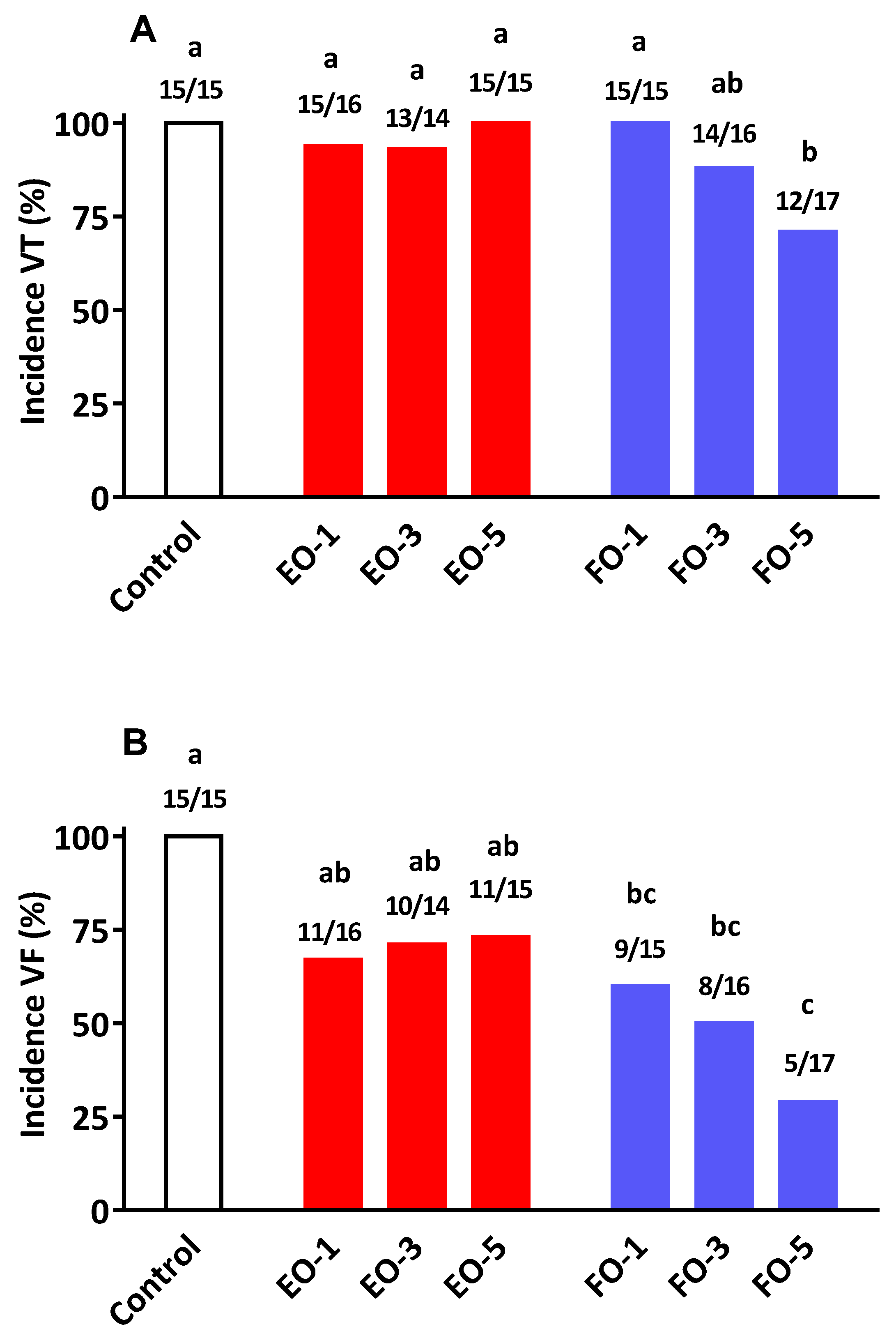 Percentage of incidence of (A) ventricular tachycardia (VT) and (B) ventricular fibrillation (VF) in rats fed standard laboratory diet (Control) or diet supplemented with Echium oil (EO, red) or Fish oil (FO, blue) at 1, 3 and 5 percentage (w/w). Numbers on top of the bars represent the incidence of VT or VF that occurred over the total number of animals measured. a, b, c Bars with different letters are significantly different (p < 0.05).