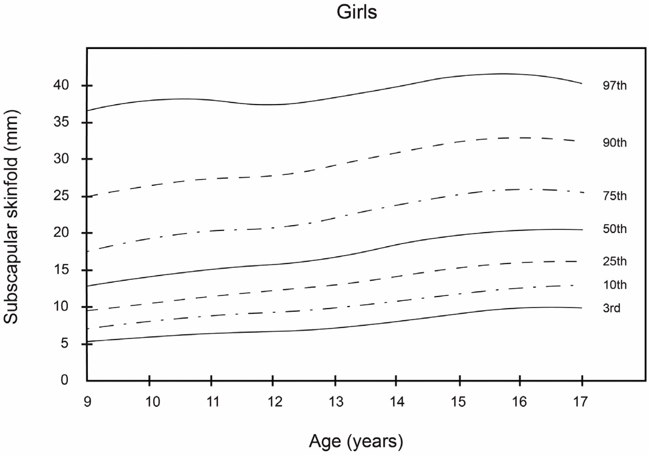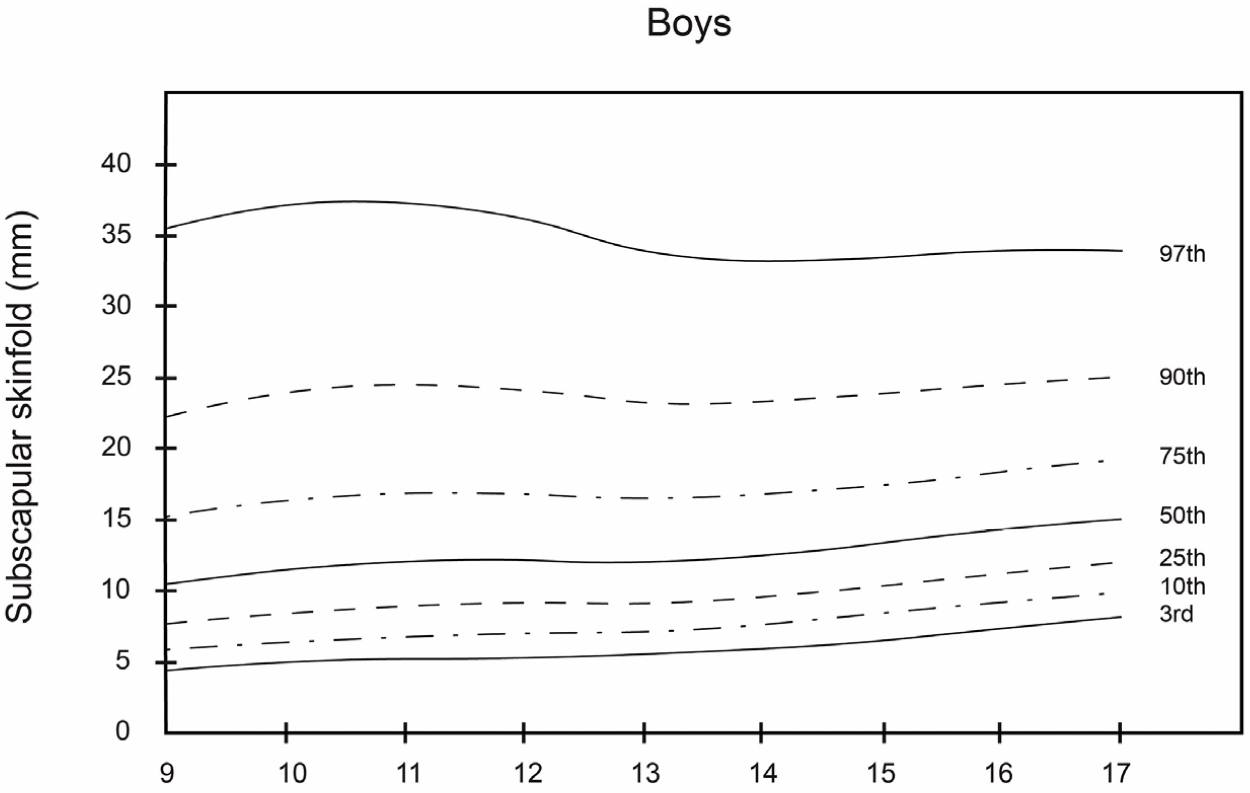 In the obesity category for boys aged 15–17.9 years, the cut-off value for subscapular skinfold was 21.8 mm. In contrast, for girls of the same age, the cut-off value was considerably higher (28.7 mm). These results were similar to those of Kromeyer-Hauschild et al. [18] for a sample population of 213 school children in Jena (Germany). In our study, the overweight and obesity cut-off values of the subscapular skinfold were much higher for girls, which reflected that girls had a higher level of subcutaneous adiposity than boys.
