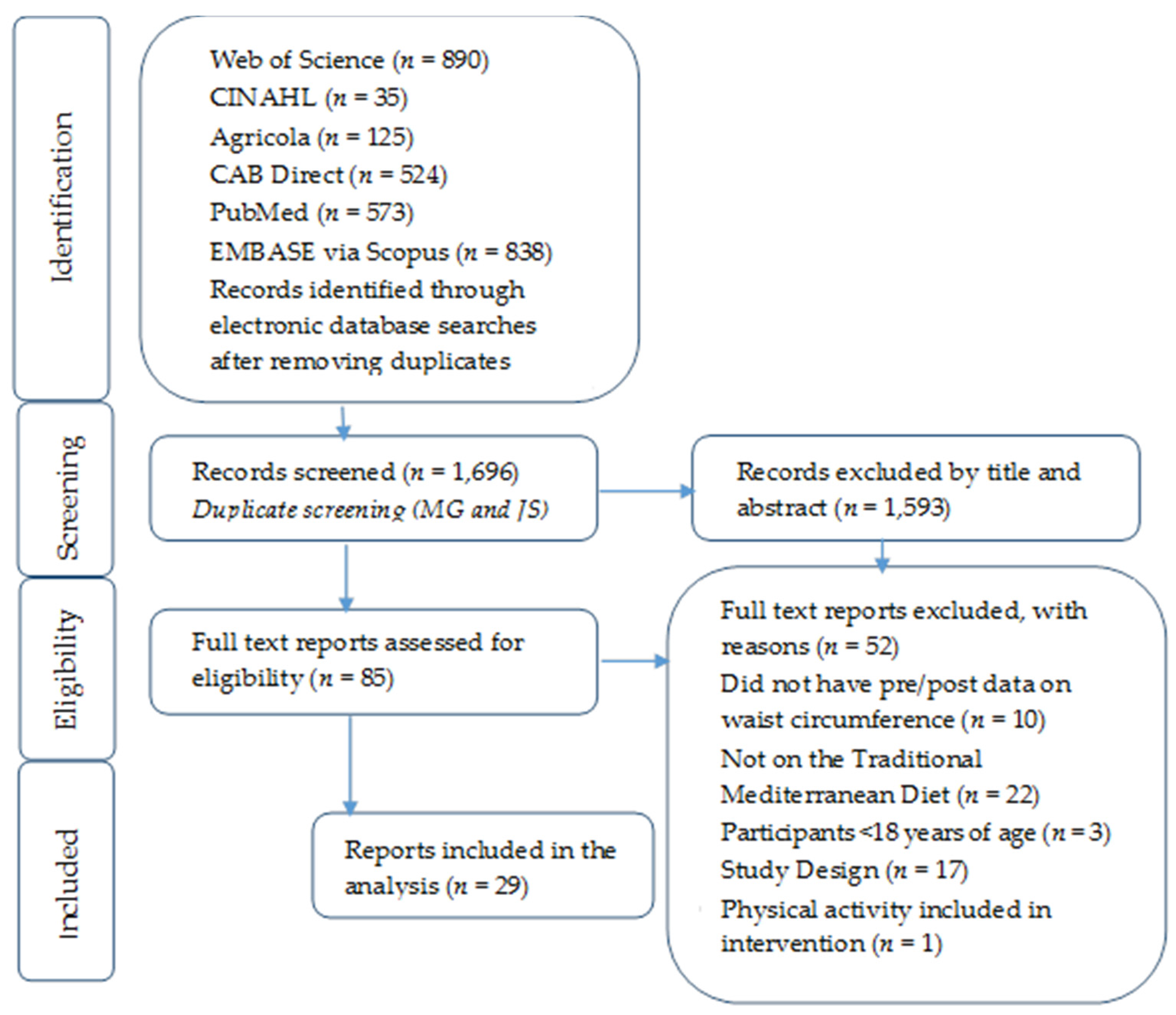 Studies had to meet the following criteria to be included: (1) report pre-and post-intervention data on waist circumference (any other metabolic risk factors were additional); and (2) focus on the MedSD as a whole dietary pattern. Studies were excluded if they (1) did not have pre- and post-intervention data on waist circumference; (2) focused on particular components of the Mediterranean diet, such as only olive oil; (3) included exercise in the intervention; (4) included participants <18 years of age; (5) restricted calorie intake; and (6) did not report the information in a way that would allow effect sizes to be calculated using the published information. The relevance of studies was assessed by two independent researchers (M.G. and J.S.) with a hierarchical approach on the basis of title, abstract, and full manuscript. The original search resulted in 1696 abstracts with relevant key words. After screening and hand-searching articles, 29 articles (39 total comparisons) that used the traditional MedSD were included in analysis. Refer to Figure 1 for the PRISMA figure of included and excluded articles. A list of excluded articles is available in the supplemental material (Table S1).