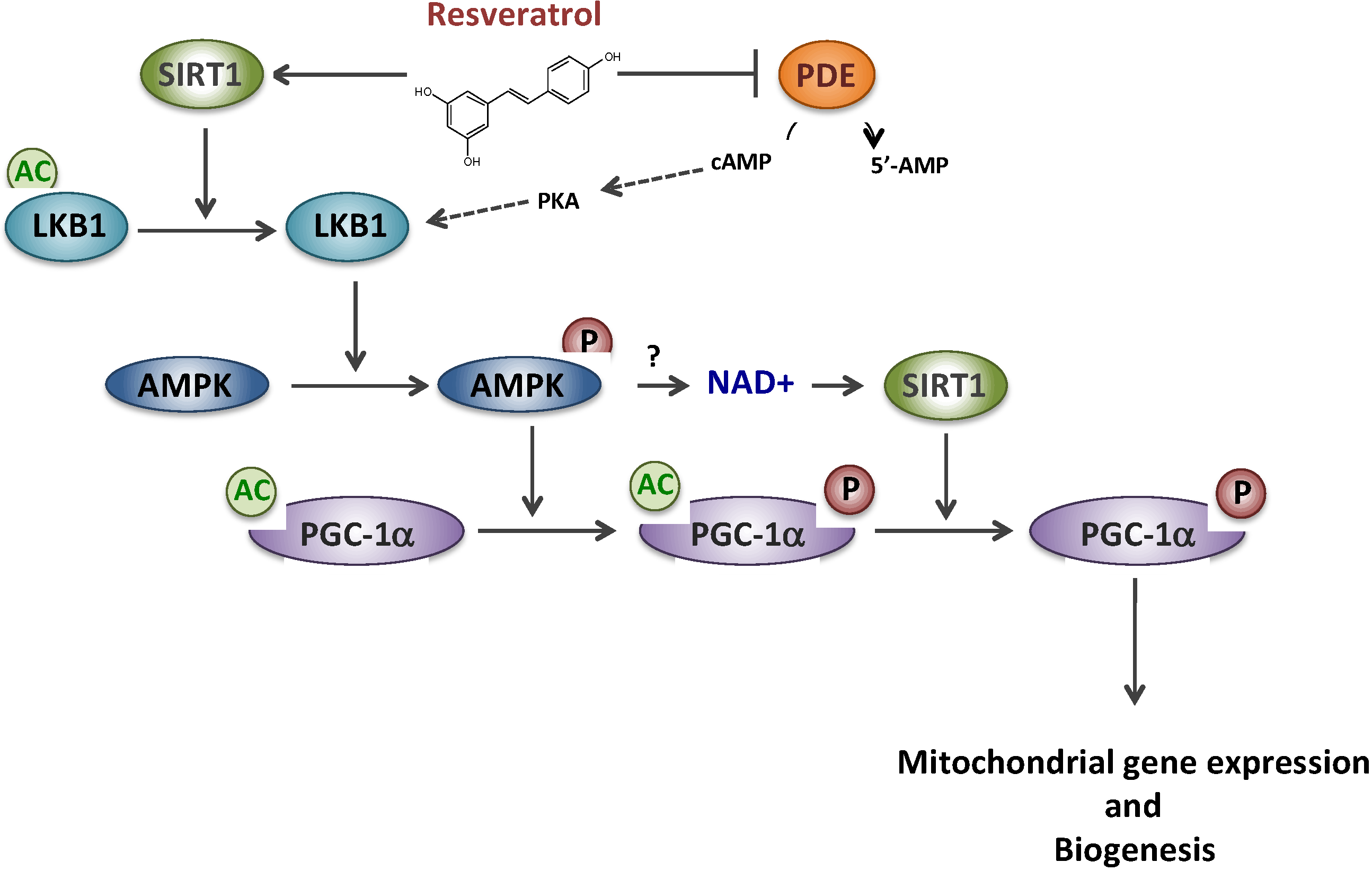 Resveratrol and putative signaling pathways involving SIRT1, AMPK and PDE. Sirtuin 1 (SIRT1), AMP-activated protein kinase (AMPK), Phosphodiesterase (PDE), cyclic AMP(cAMP), Protein kinase A (PKA), Liver linase B1 (LKB1), PPAR gamma co-activator 1 alpha (PGC-1α).