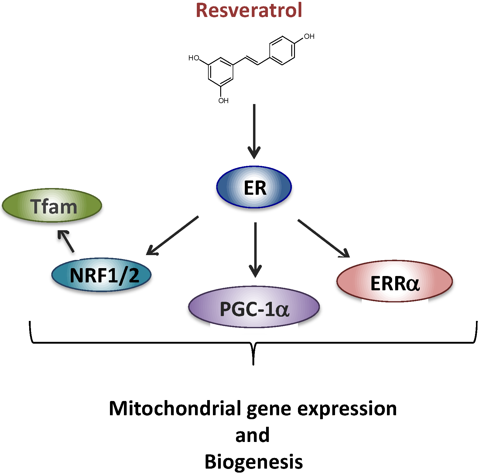 Proposed signaling pathway for the effect of resveratrol involving ER (estrogen receptor). Estrogen related receptor alpha (ERRα), PPAR gamma co-activator 1 alpha (PGC-1α), nuclear respiratory factors 1 and 2 (NRF1, NRF2), mitochondrial transcription factor A (Tfam).