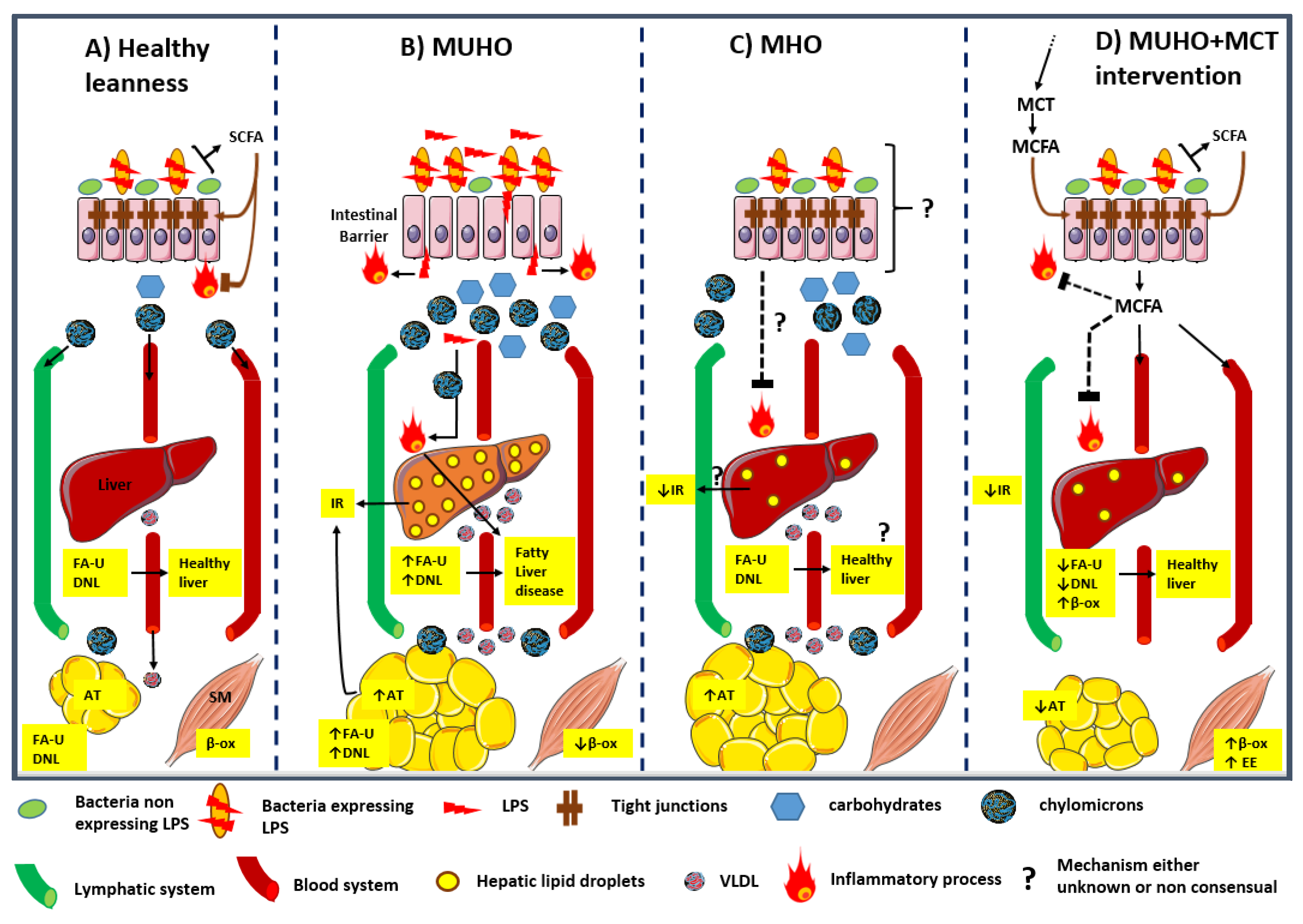 Crosstalk between gut, liver and peripheral metabolic tissues under 4 metabolic states. Under condition of healthy leanness (A) an optimal relative abundance of LPS-expressing vs. non-expressing bacteria contribute to gut impermeability, low intestinal and hepatic inflammation, and non-obesogenic/steatogenic nutrient supply. Under MUHO conditions (B), an elevation in the relative abundance of LPS-expressing bacteria (Gram-negative) induces LPS infiltration and leads to altered intestinal barrier integrity, local inflammation, liver injury and endotoxemia. At the same time, a high fat and carbohydrate supply contributes to adiposity, hepatic steatosis and peripheral insulin resistance. In MHO subjects (C), despite an adiposity sustained by a rich diet, a balanced gut microbiota would contribute to maintain intestinal and systemic metabolic health, prevent endotoxemia, and lower hepatic injury and peripheral insulin resistance. Our hypothetical model (D) suggests that diet MCT supplementation for MUHO subjects may facilitate a shift towards an MHO-like profile by improving lipid catabolism and lowering adiposity in part, but also by remodelling the gut microbiota into a metabolically beneficial structure. SCFA: short chain fatty acids; FA-U: Fatty acid uptake; AT: adipose tissue; DNL: de novo lipogenesis; SM: skeletal muscle; MUHO: metabolically unhealthy obese (or obesity); IR: Insulin resistance; β-ox: beta-oxidation; MHO: metabolically healthy obese (or obesity); MCT: medium chain triglycerides; MCFA: medium chain fatty acids; LPS: lipopolysaccharides; VLDL: very low density lipoproteins.