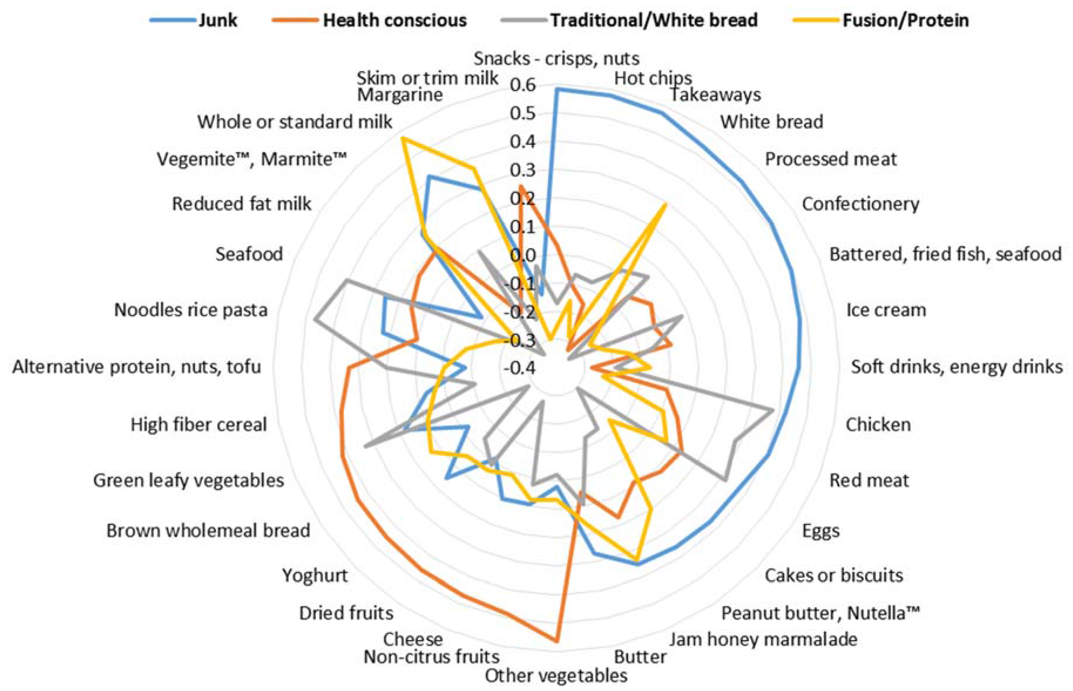 The four components were labelled ‘Junk’, ‘Health conscious’, ‘Traditional/White bread’ and ‘Fusion/Protein’. The first component was described as ‘Junk’ because of the high loadings of confectionary, snacks, takeaways, hot chips, processed meats, soft and energy drinks, battered fried fish or seafood, ice-cream and cakes or biscuits. The second component was described as ‘Health conscious’ because of the high loadings of vegetables, cheese, brown whole meal bread, non-citrus fruits, yoghurt, dried fruits, high fiber cereal, and Vegemite™ or Marmite™. The third component was described as ‘Traditional/White bread’ because of the high factor loadings for whole or standard milk, white bread, margarine, jam honey marmalade, peanut butter, Nutella™ and low fiber and/or high sugar cereals. The fourth component was described as ‘Fusion/Protein’ because of the high factor loadings for noodles rice pasta, seafood, chicken, green leafy vegetables, eggs and red meat (Figure 1).