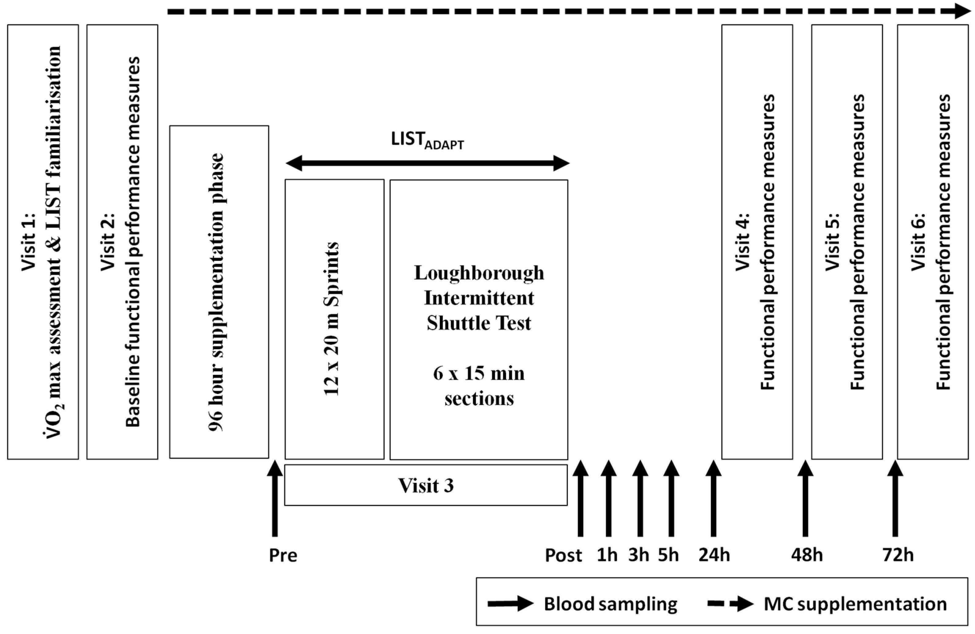 Participants returned to the laboratory for visit 2 within 5 days to complete the battery of baseline functional measures that followed a standardised warm up; these were countermovement jump height (CMJ), 20 m sprint time (20 m), MVIC of the knee extensors, agility (5-0-5), which were preceded by assessment of active muscle soreness (DOMS). Participants were then provided with 24 MC or PLA beverages in a double blind manner along with verbal and written instructions on how to consume the beverages. They were also provided with a diet record diary and a list of foods to avoid throughout the 4 days prior to and during the trial period. During the 4 day period leading up to the trial day, participants were contacted and instructed to begin supplementation and dietary restrictions.