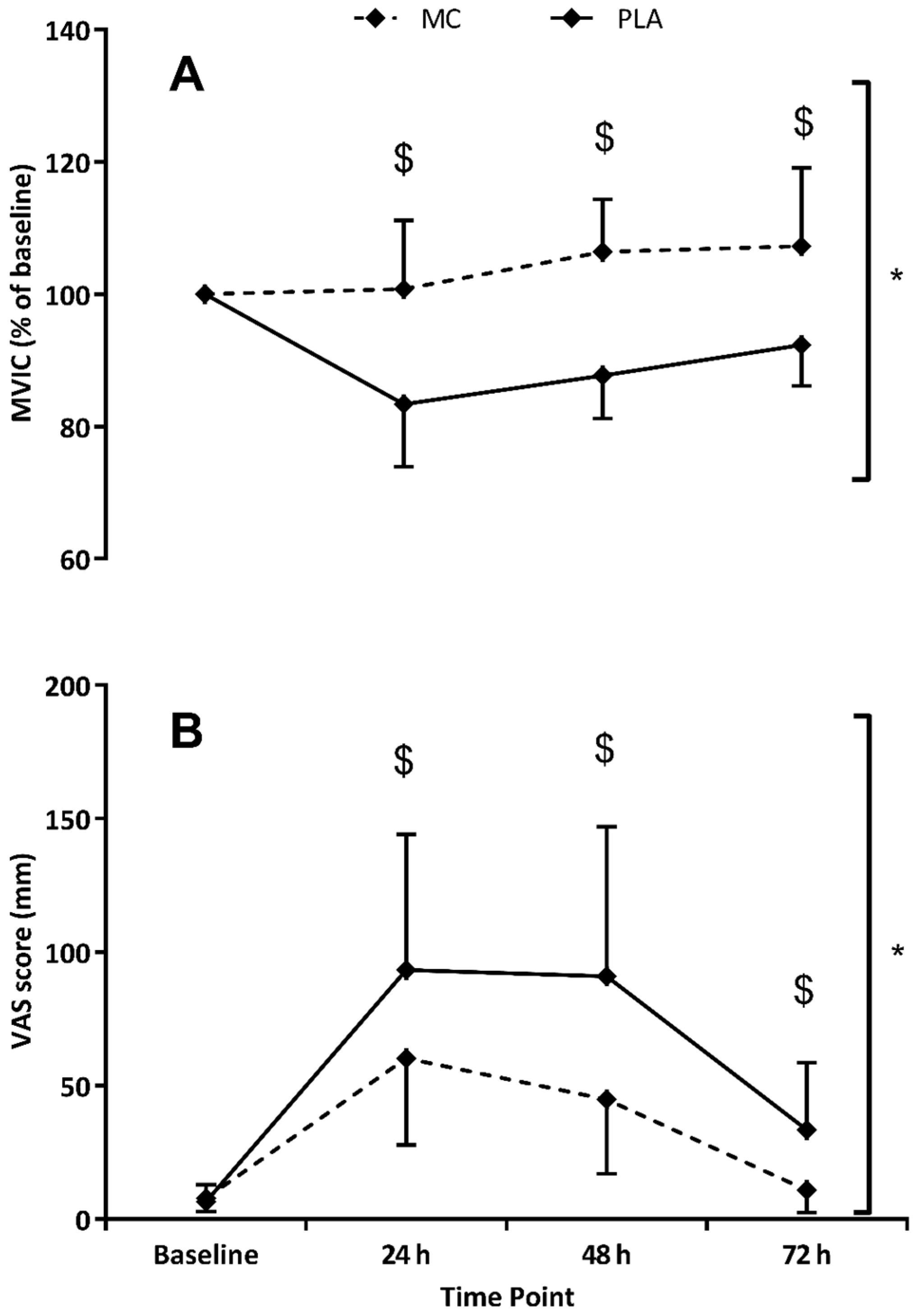 Changes in maximum voluntary isometric contraction (MVIC; Panel (A)) and delayed onset muscle soreness (DOMS; Panel (B)) in response to Montmorency cherry (MC) or placebo (PLA) supplementation. * Group effect; $ Interaction effect (p < 0.05).