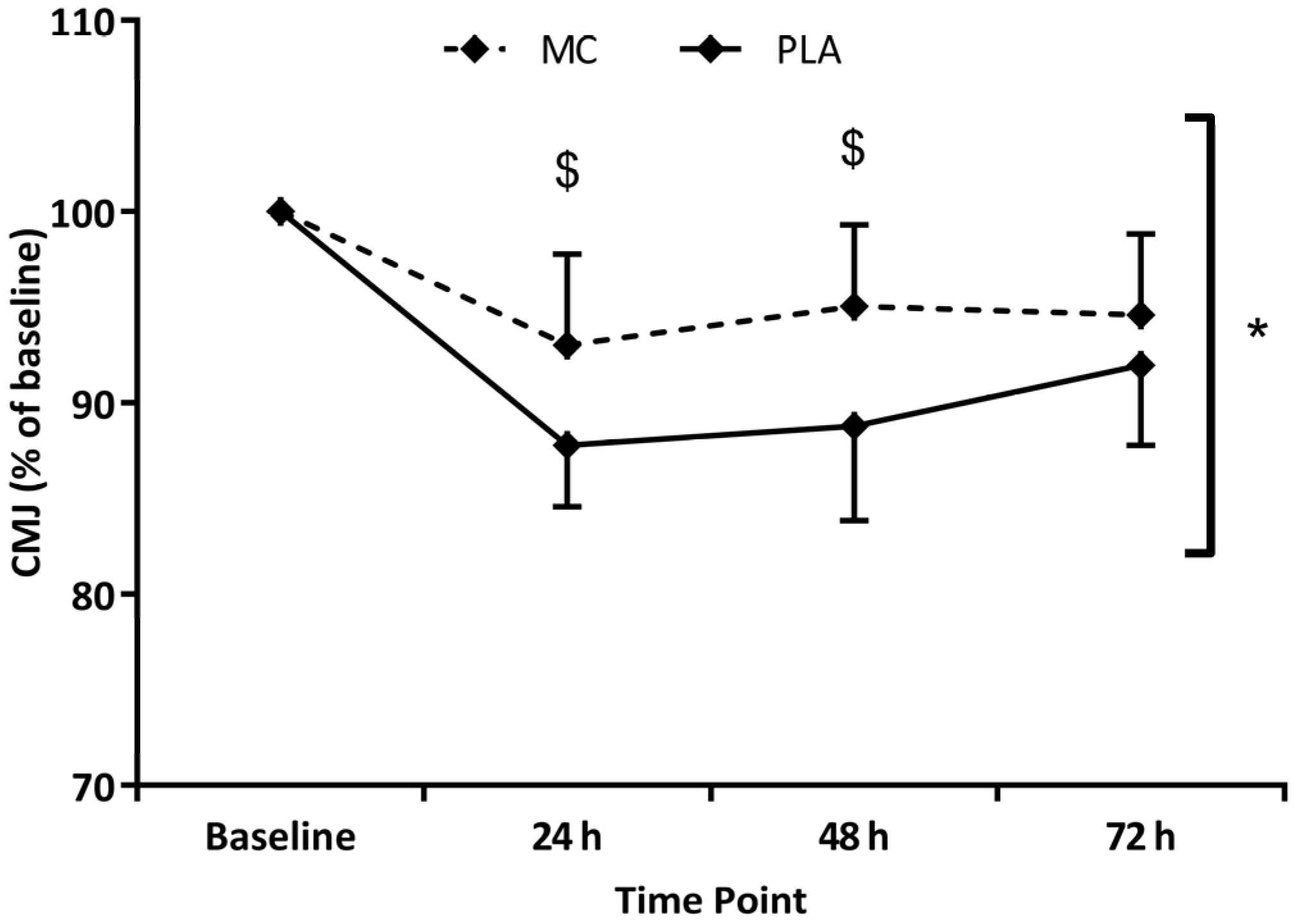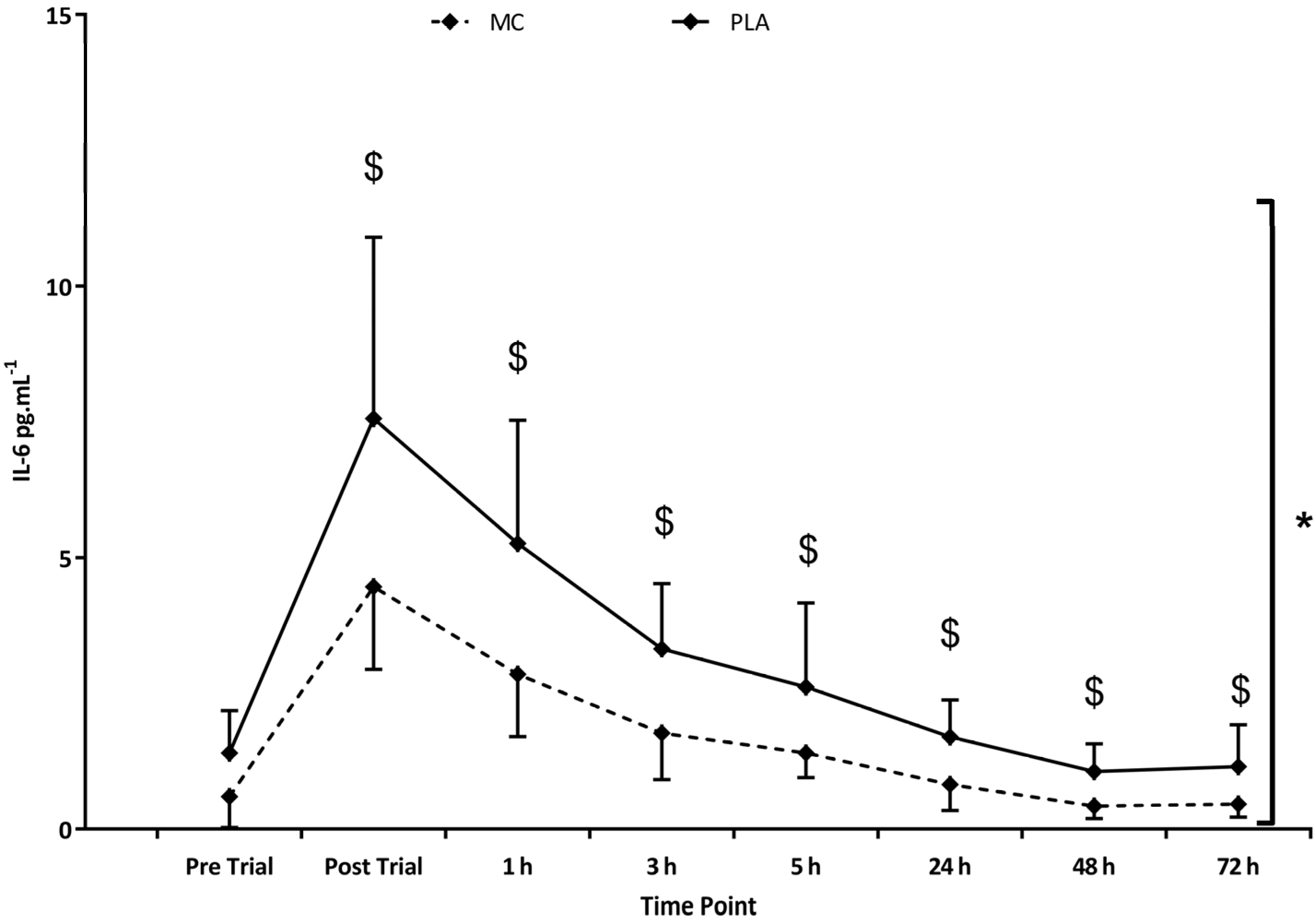 The main finding of this study was that participants supplemented with MC were able to maintain greater functional performance than PLA counterparts following prolonged intermittent sprint activity. More specifically, MVIC, CMJ, 20 m sprint and 5-0-5 agility performances were superior in the 72 h post-exercise with MC (vs. PLA). In addition, DOMS and IL-6 were lower in the MC group throughout the post-trial period.