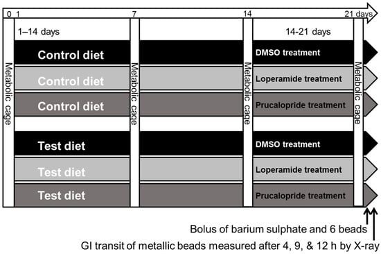This study was designed to include one control group and five test diet treatment groups that were also treated with modulatory drugs, either 4 mg/kg/day prucalopride or 1 mg/kg/day loperamide or dimethyl sulfoxide (DMSO) control carrier (Figure 1). The study was carried out as a block design as six blocks of ~36 animals, with age and weight balanced among treatment groups (i.e., 18 groups × 12 animals per group), which resulted in 9–13 animals for each diet plus the drug treatment group.