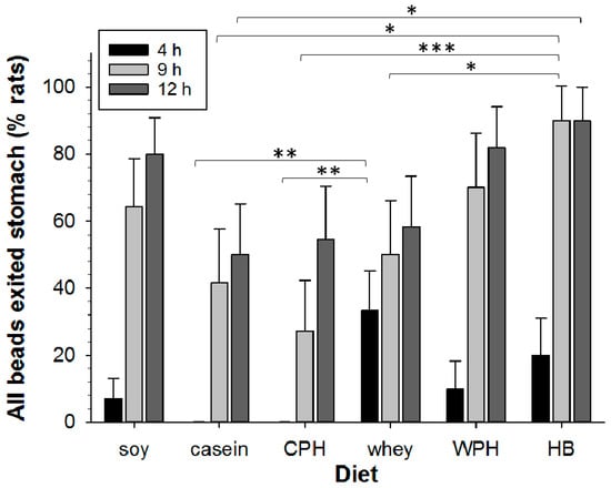 Comparison of gastric emptying (GE) of beads over 12 h for animals treated with soy or milk protein diets (n = 8–15 animals per group). The percentage of rats in which all beads had exited the stomach (mean per treatment) is shown at 4 h (black), 9 h (light grey), and 12 h (dark grey) for: soy, casein, hydrolyzed casein (CPH), whey, hydrolyzed whey (WPH), and hydrolyzed blend (HB). Asterisks indicate the significance of each treatment relative to controls (* p < 0.05; ** p < 0.01; *** p < 0.001). Data show mean ± SEM.