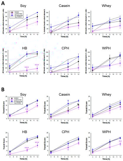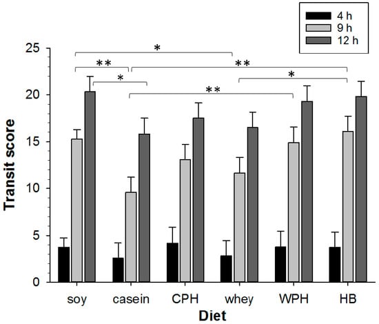 Comparison of GI transit tracked over 12 h for animals treated with soy or milk protein diets (n = 1–14 animals per group). Transit scores are shown at 4 h (black), 9 h (light grey), and 12 h (dark grey) for: soy, casein, hydrolyzed casein (CPH), whey, hydrolyzed whey (WPH), and hydrolyzed blend (HB). Asterisks indicate the significance of each treatment relative to controls (* p < 0.05; ** p < 0.01). Data show mean ± SEM.