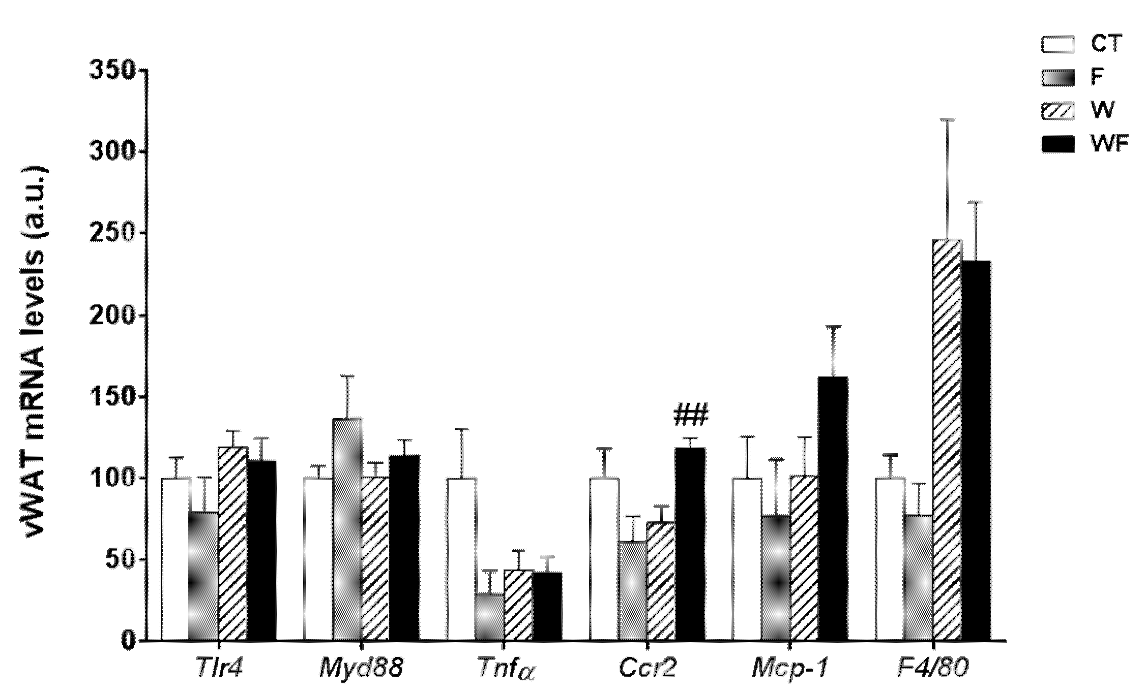Bar plots showing the relative levels of specific mRNAs of pro-inflammatory molecules from Control (CT, mice fed standard solid-chow), Fructose (F, mice fed standard solid-chow plus a 15% fructose solution ad libitum), Western (W, mice fed Western solid-chow), and Western + Fructose (WF, mice fed Western solid-chow plus a 15% fructose solution ad libitum), represented as mean (a.u., arbitrary units) ± SEM of five different visceral adipose tissue samples. ## p < 0.01 vs. W values.