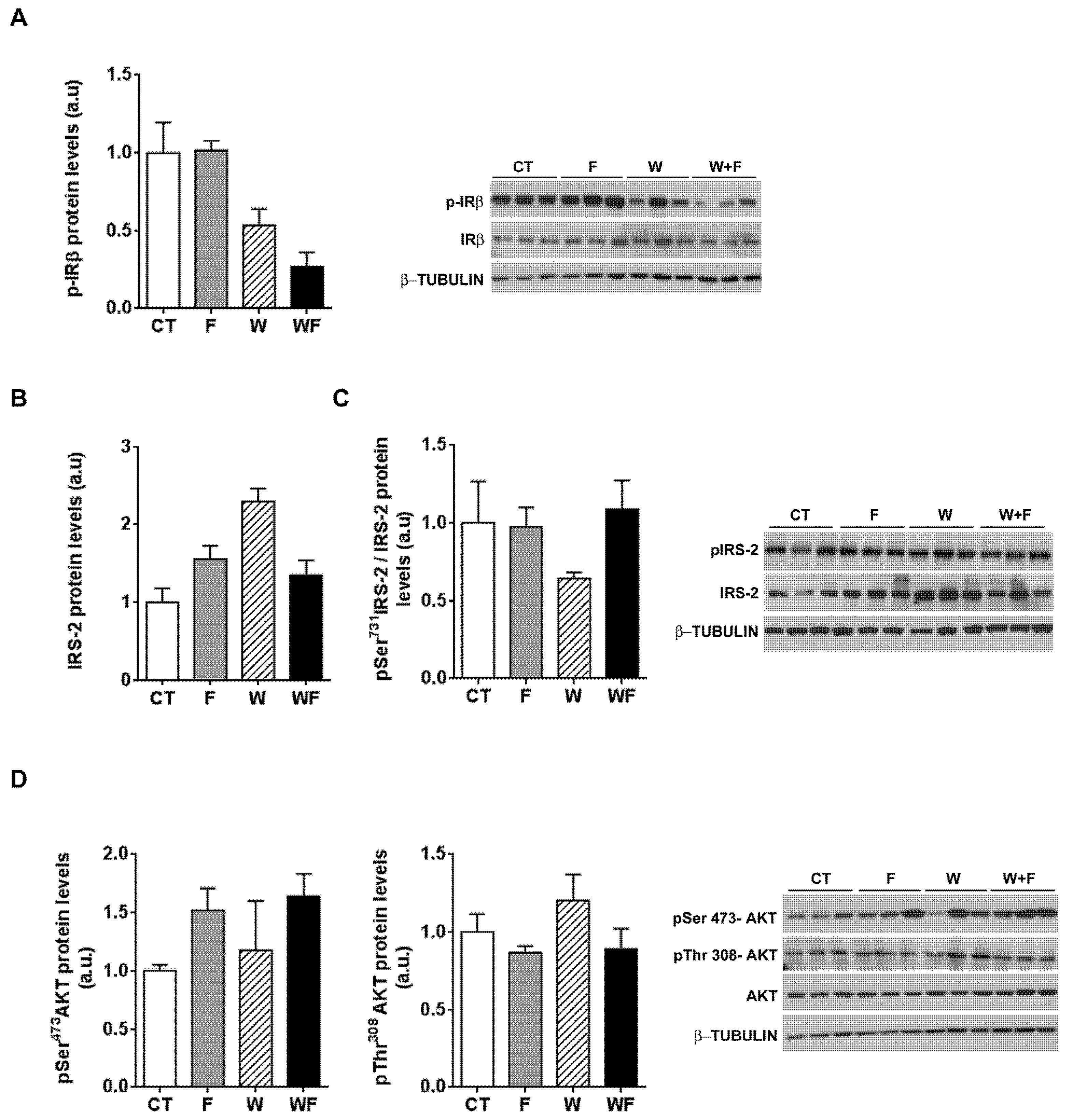 To further explore whether hepatic insulin sensitivity was impaired, we injected insulin (0.15 units/g body weight) in a subset of rats and 15 minutes later we assessed the phosphorylation status of several molecules related to insulin signalling: the beta subunit of the insulin receptor (IR-β), IRS-2 and Akt. As shown in Figure 6A, insulin-induced IR-β phosphorylation tended to be lower in W and WF groups, but these differences did not reach significance. On the other hand, under acute insulin-stimulated conditions, neither the phosphorylation of IRS-2 at Ser731, nor Akt phosphorylation at both Thr308 and Ser473 positions were modified by any of the dietary interventions (Figure 6B–D).